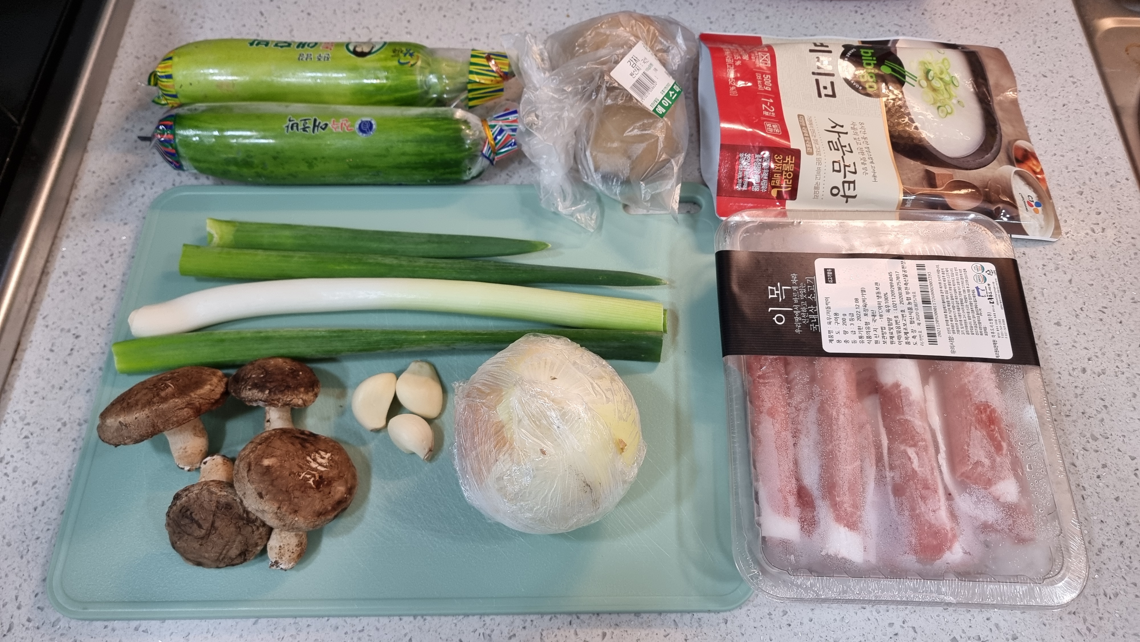 4인분 기준 재료는 사골곰탕 500g, 차돌박이 200g, 감자 두개, 애호박 두개, 대파 한줄, 양파 한개, 표고버섯 세네개 그리고 통마늘 세네개 입니다.