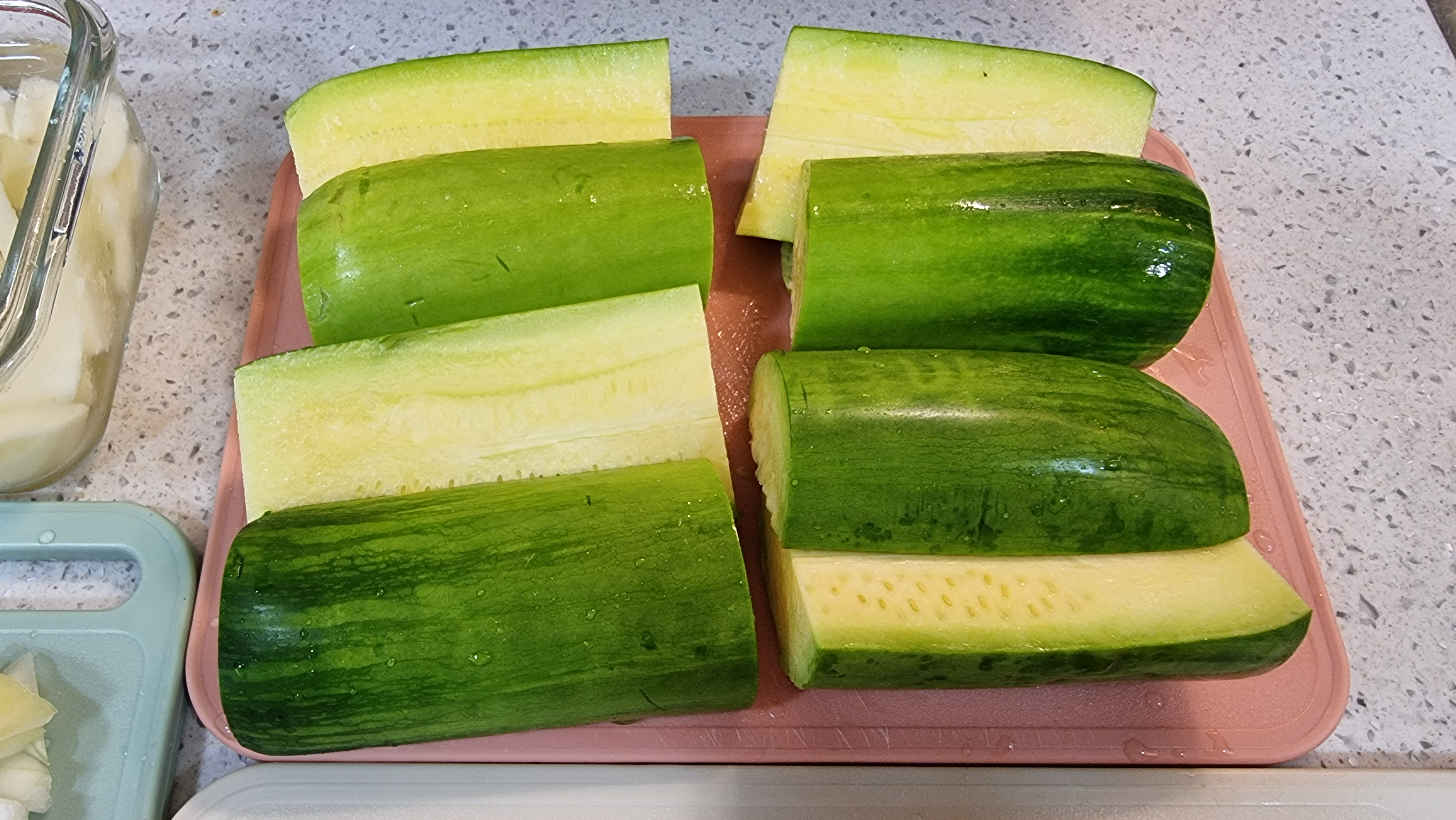 애호박 두개는 각 네덩이로 잘라둡니다.