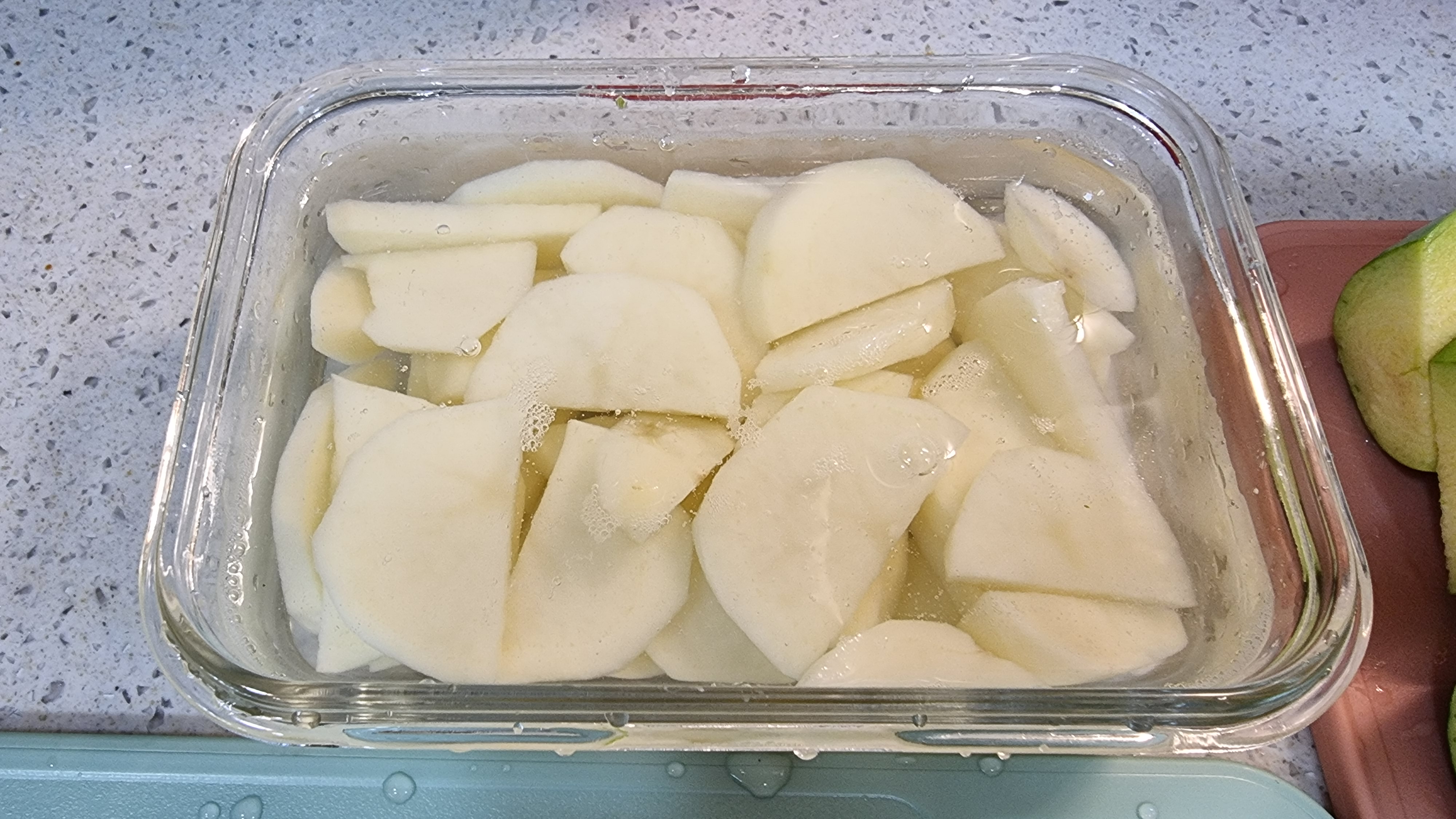 감자는 껍질을 까주고 얇게 썰어서 찬물에 담궈서 전분기를 빼줍니다.