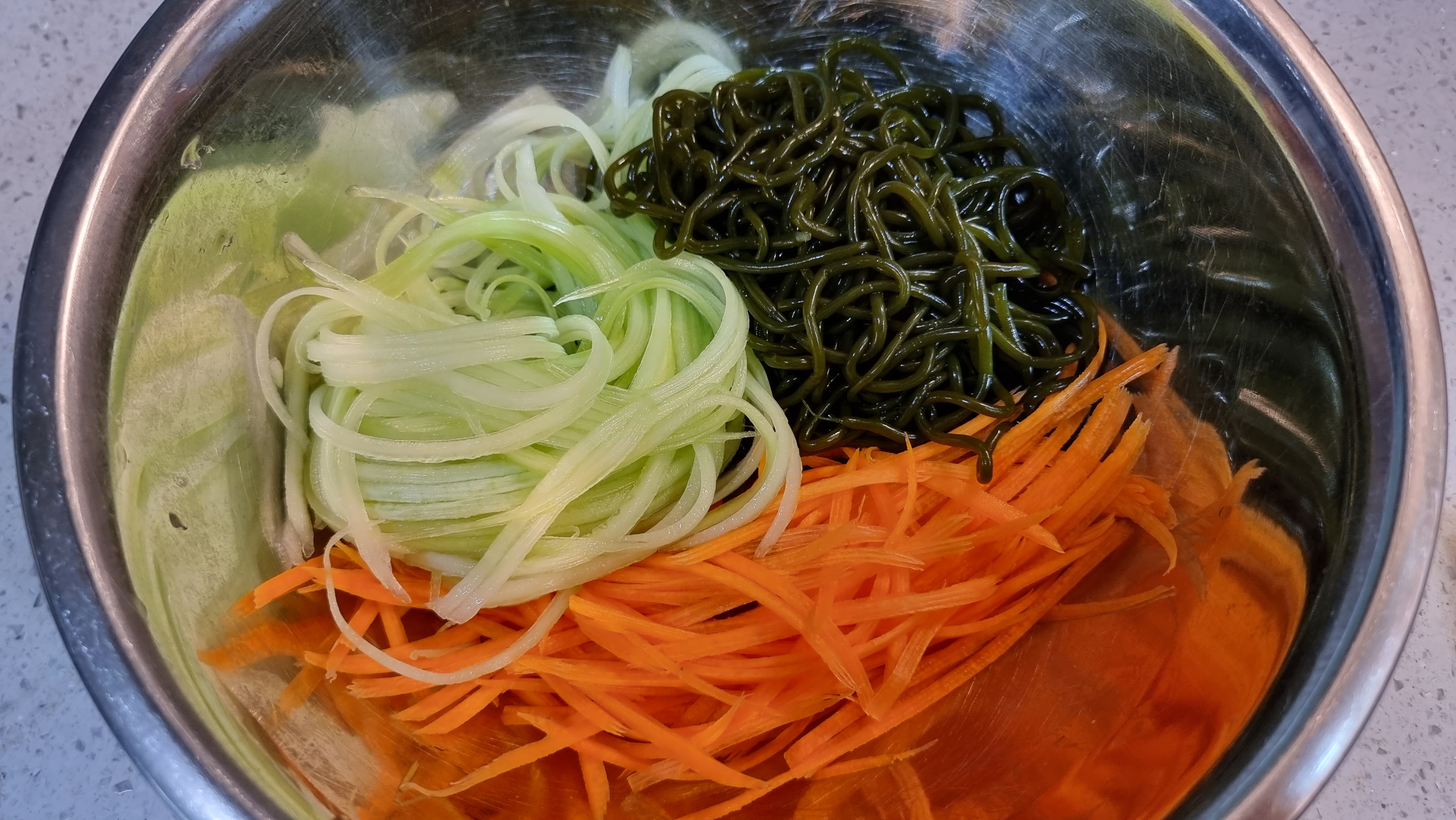 미역 당근 오이 국수를 모두 스테인레스 보울에 담아주고..