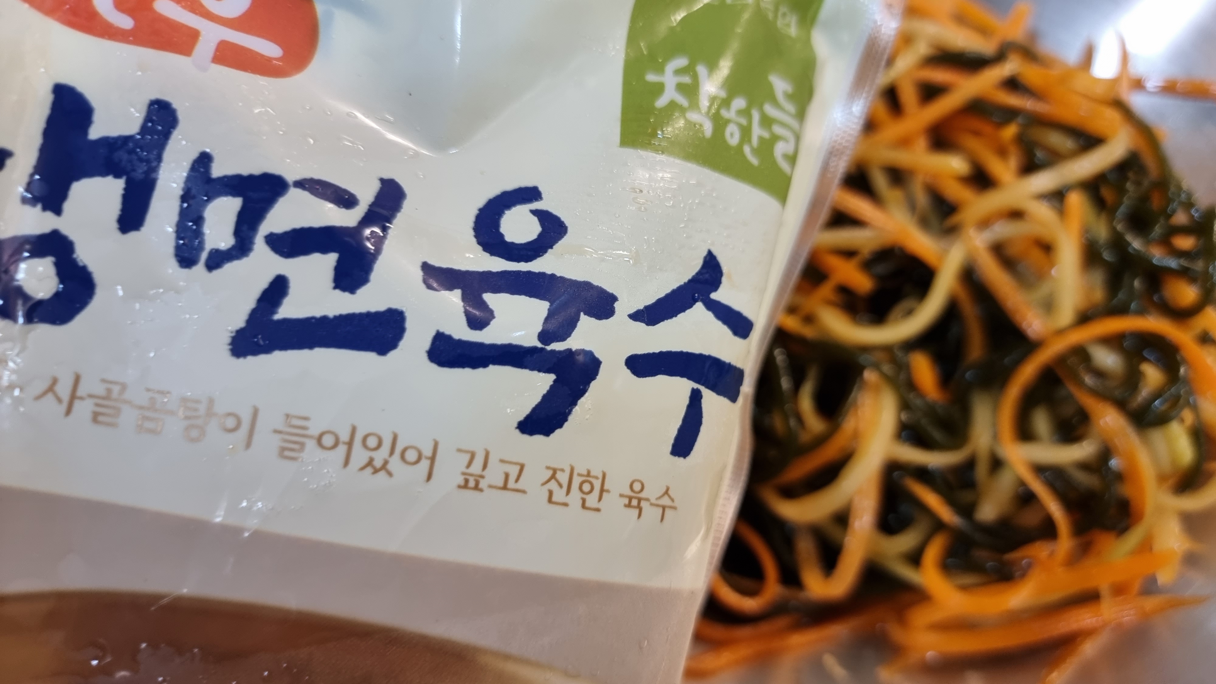 미역국수 한팩 180g으로 살짝 양이 부족한 감이 있어서 당근과 오이 한개를 추가 했습니다. 시원한 냉국수를 만들거라 시판 냉면육수 330ml 한팩도 함께 준비하였습니다.
