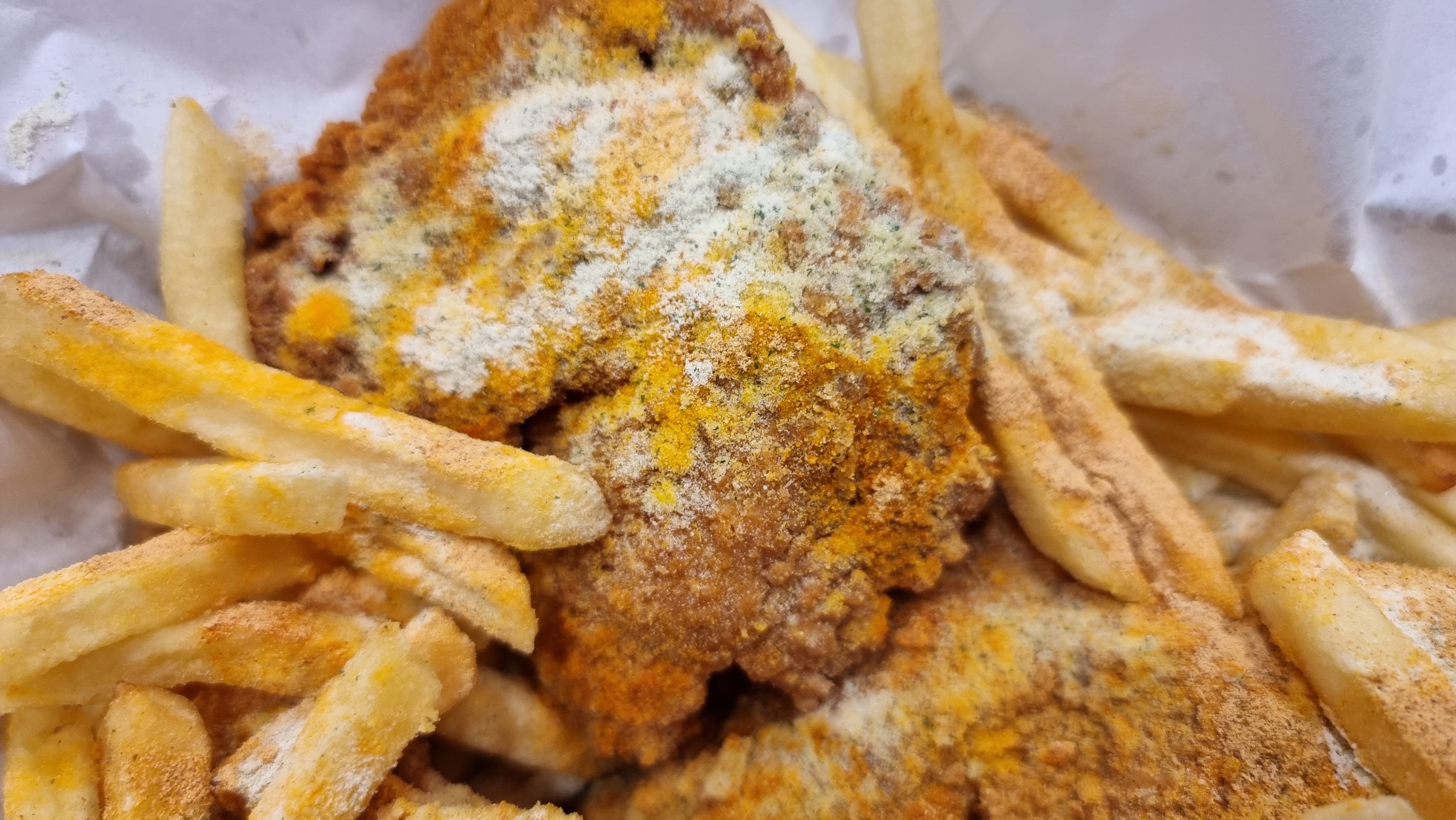 오니언시즈닝, 치즈시즈닝, 칠리시즈닝 삼종셋트를 치킨과 감자튀김 위에 조심스럽게 뿌려줍니다.