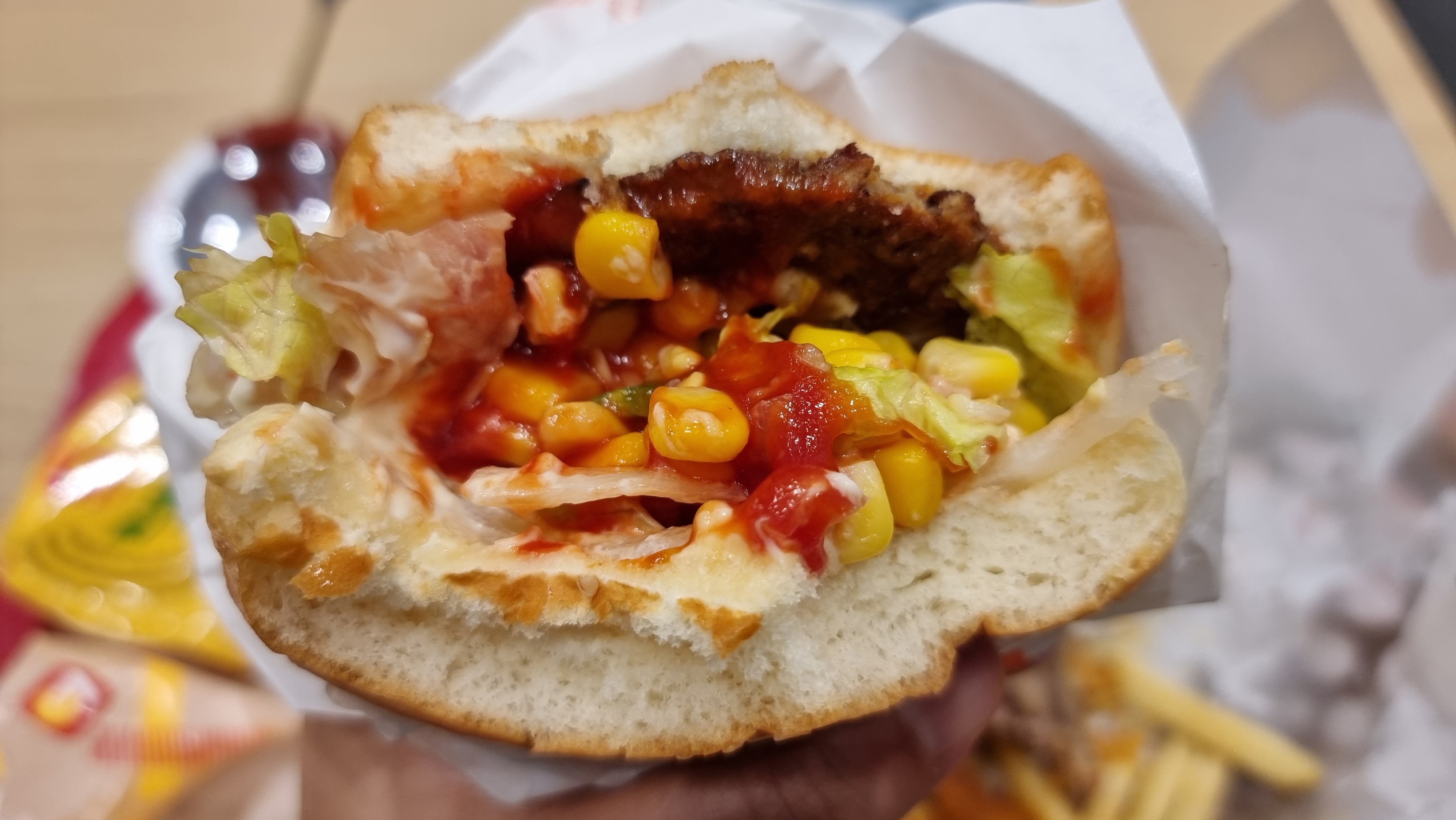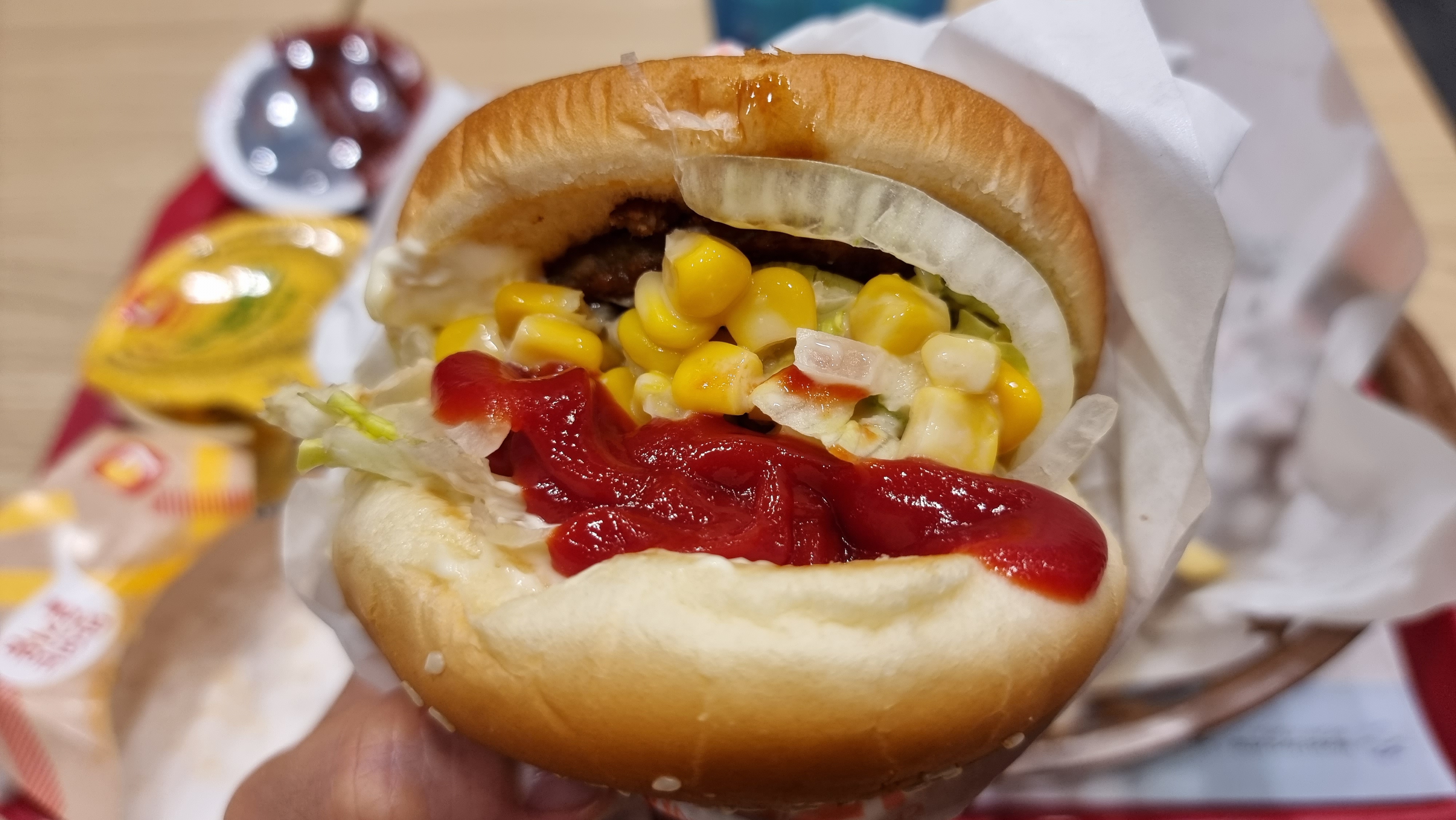 데리버거엔 감자튀김용 케첩과 콘샐러드를 잔뜩 넣어주고