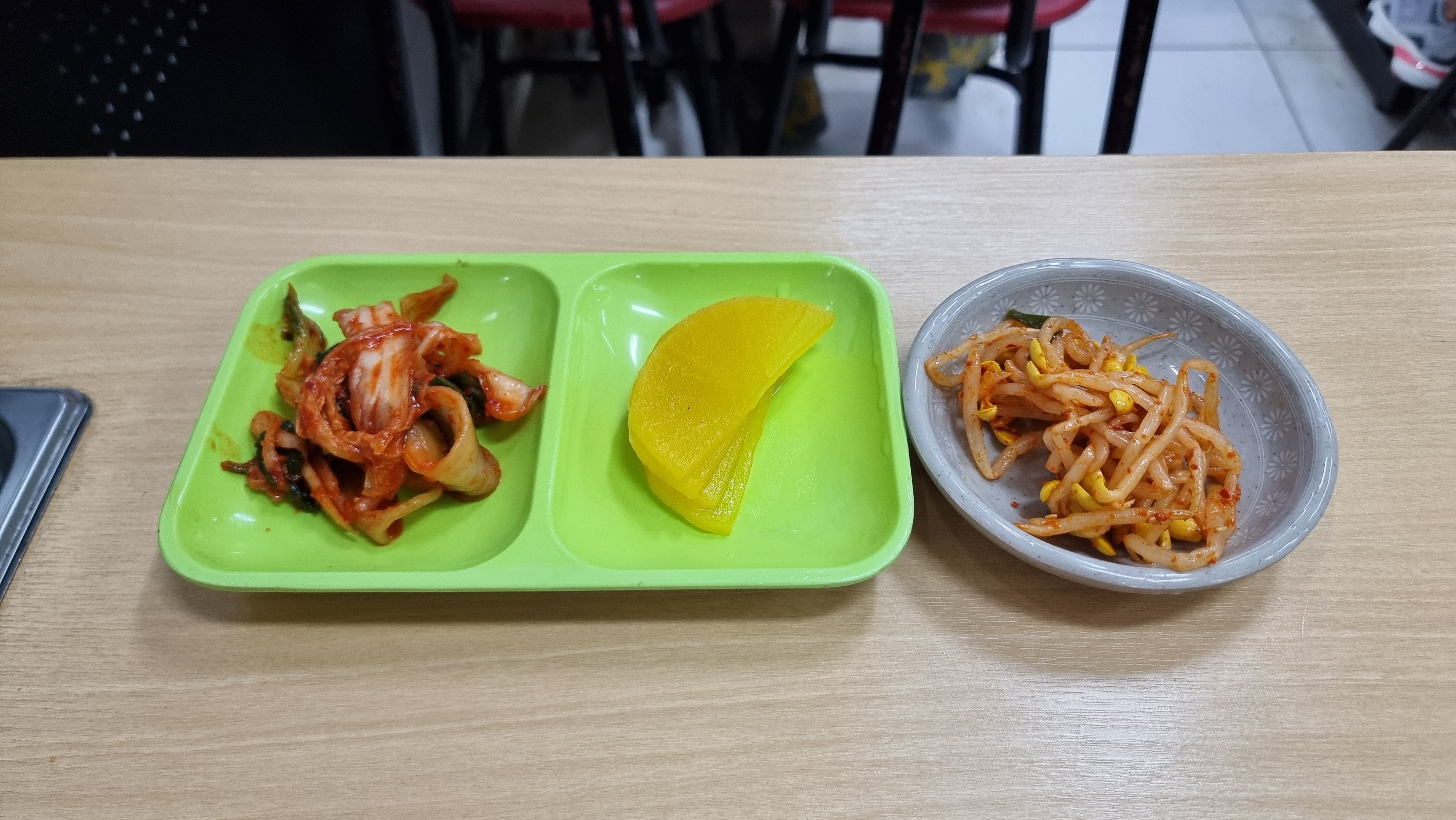기본찬으로 나오는 김치와 단무지 그리고 콩나물 무침입니다.