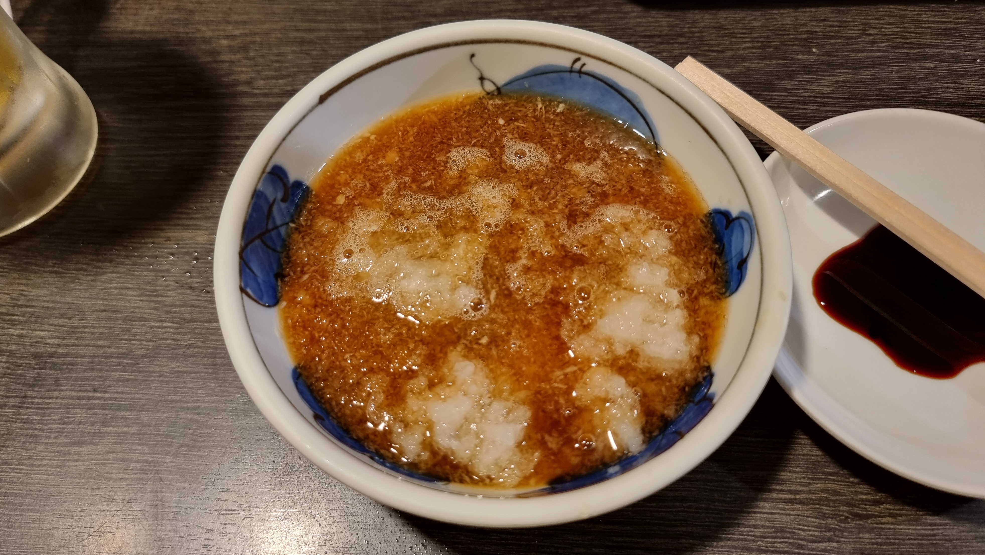 튀김 종류를 주문하면 밥공기같은 크기의 그릇에 튀김용 갈은무가 잔뜩 들어있는 튀김용 양념간장을 가져다 주십니다.