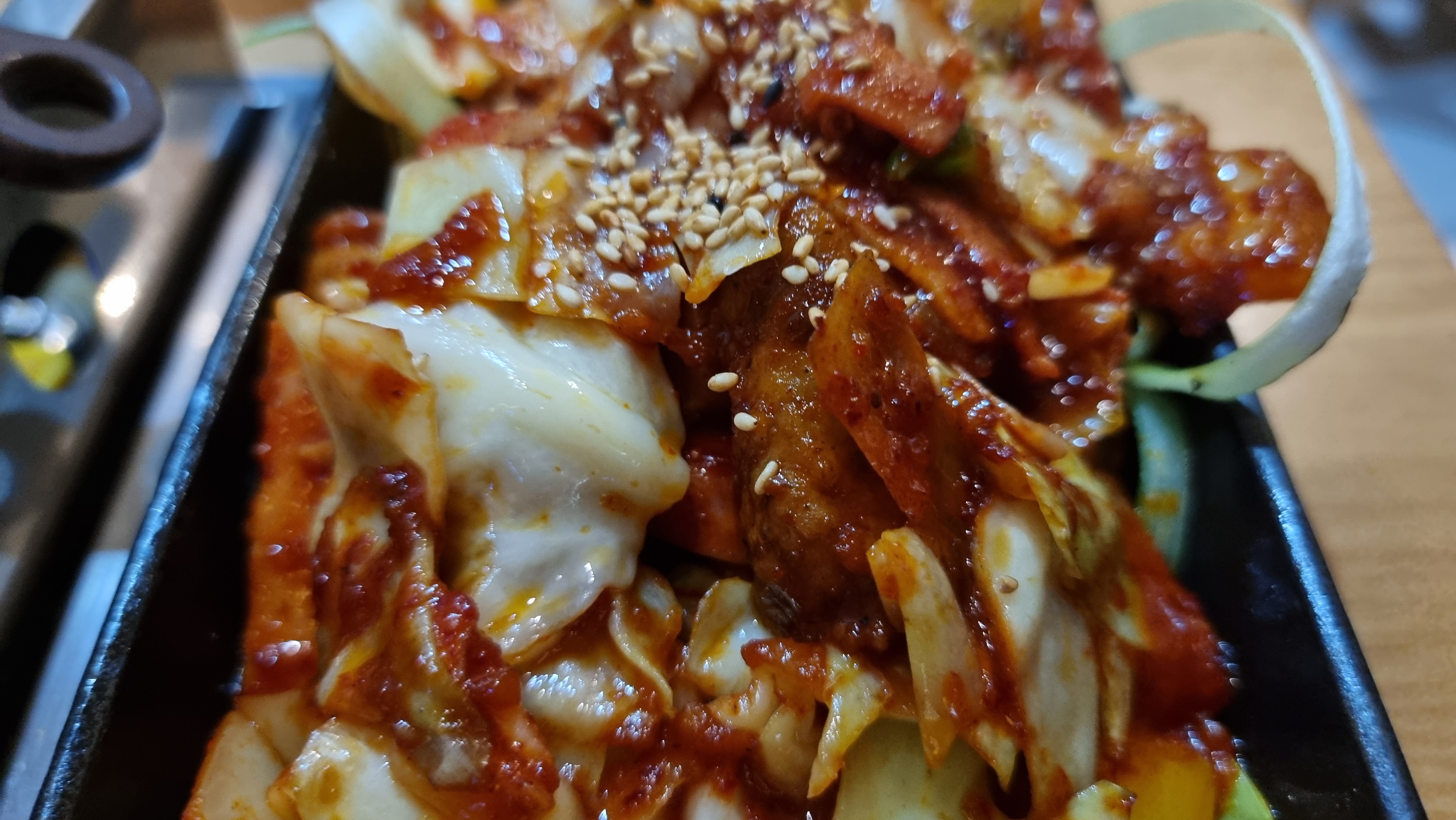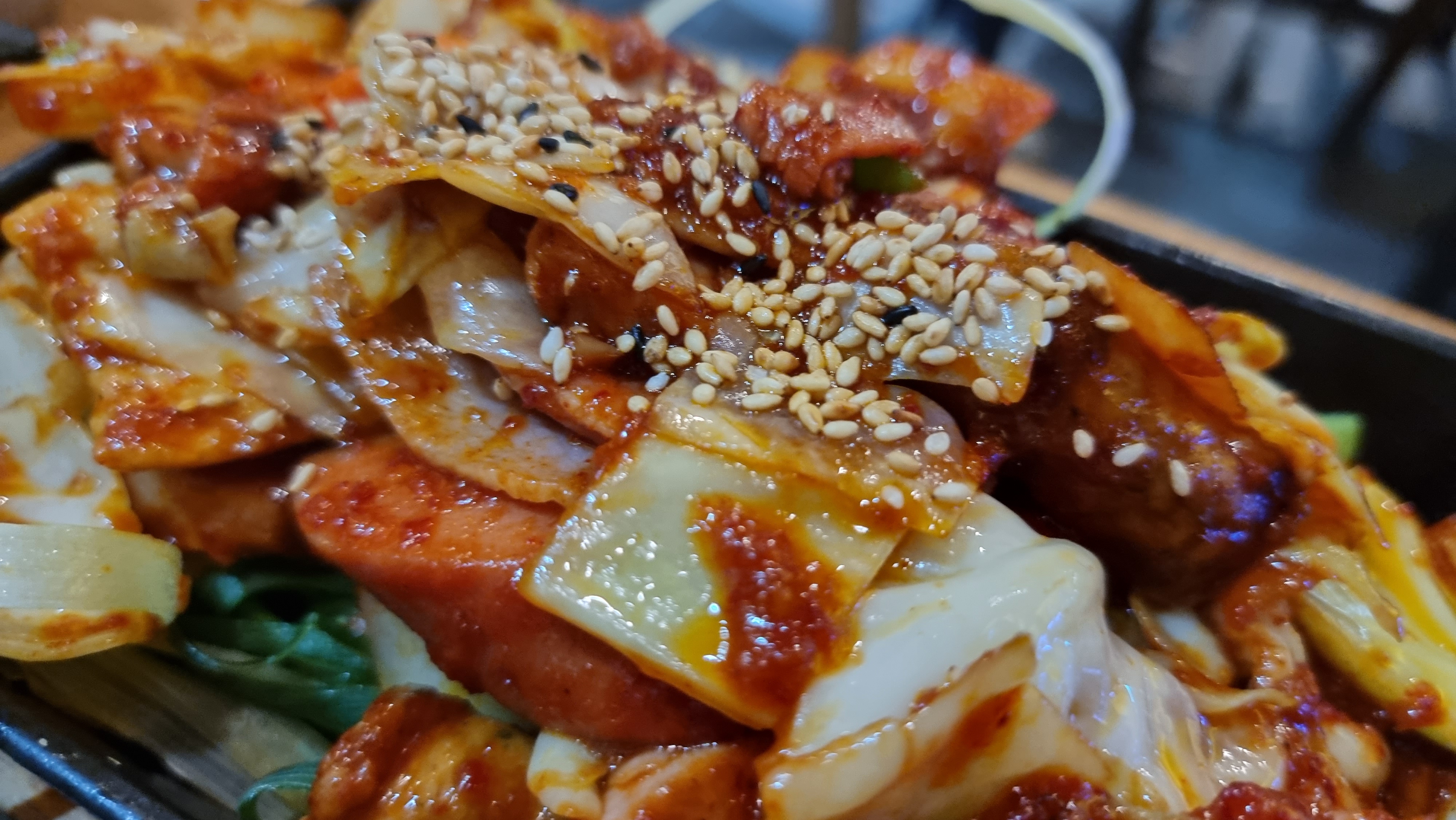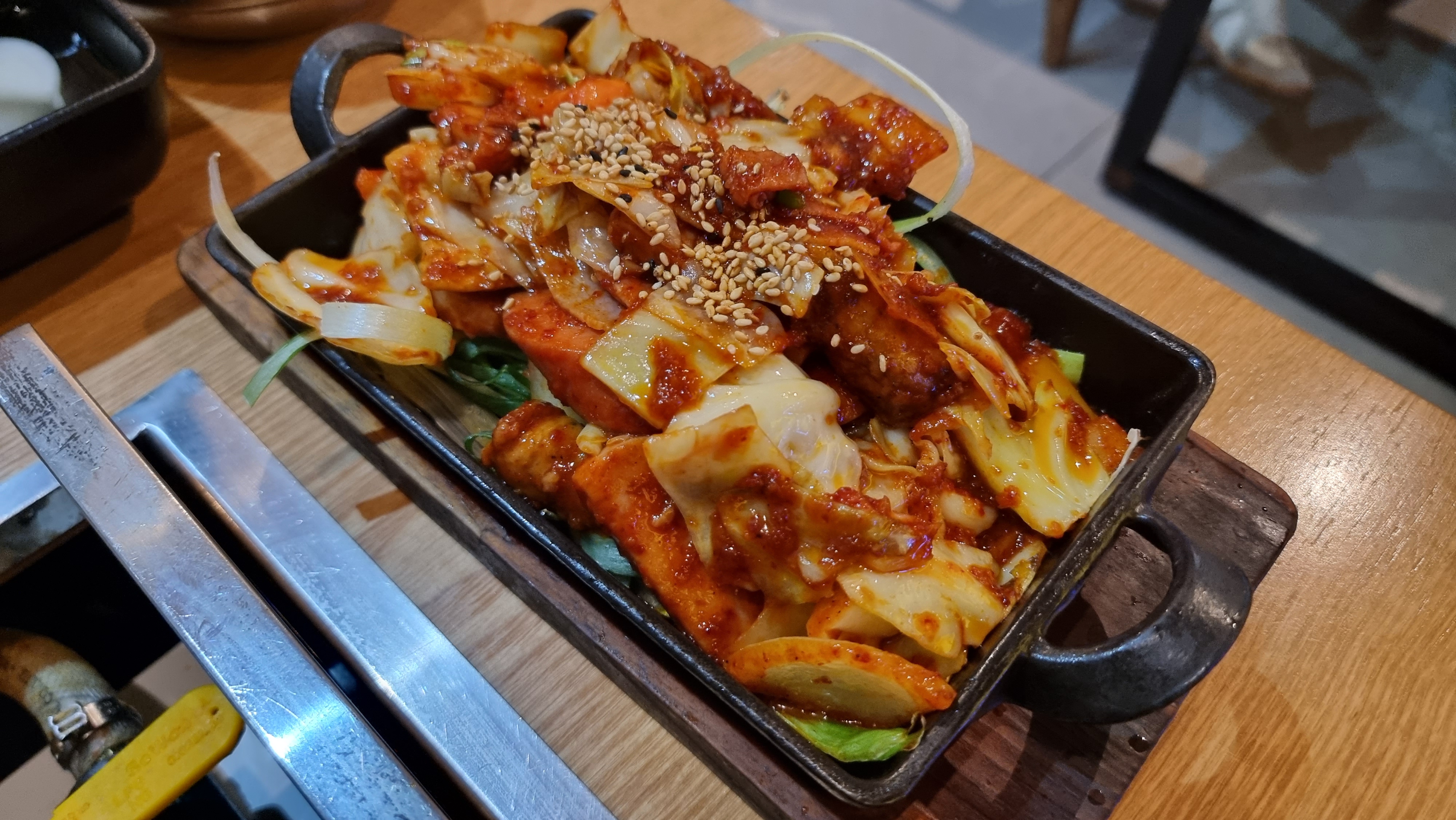 불향과 매운향이 화악 올라오는 쏘세지 볶음같은 모양새의 철판 부대볶음입니다.