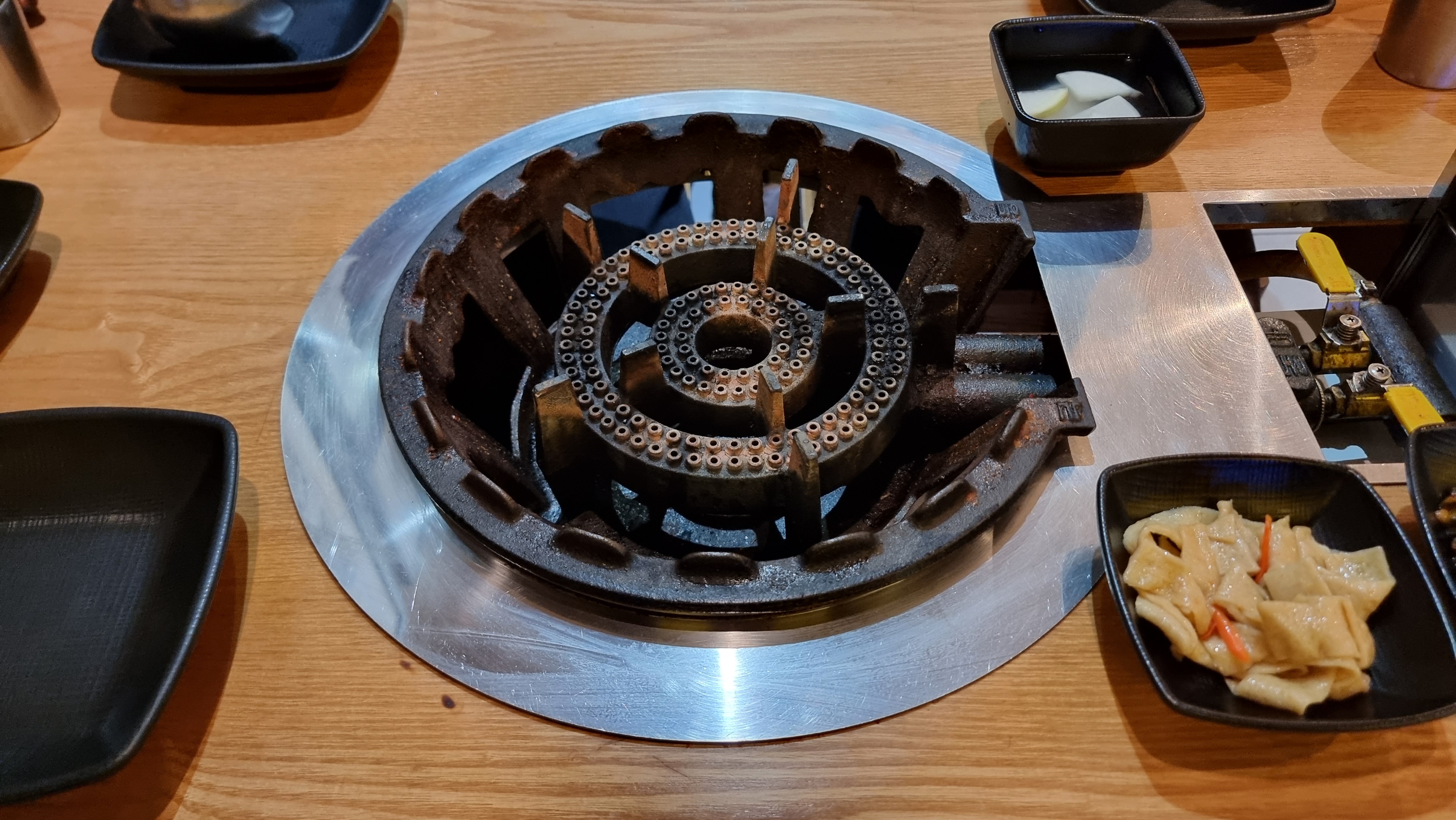 테이블에 앉으면 일반 가스렌지가 아니라 화력이 아주 센 업소용 화구가 설치되어 있습니다.