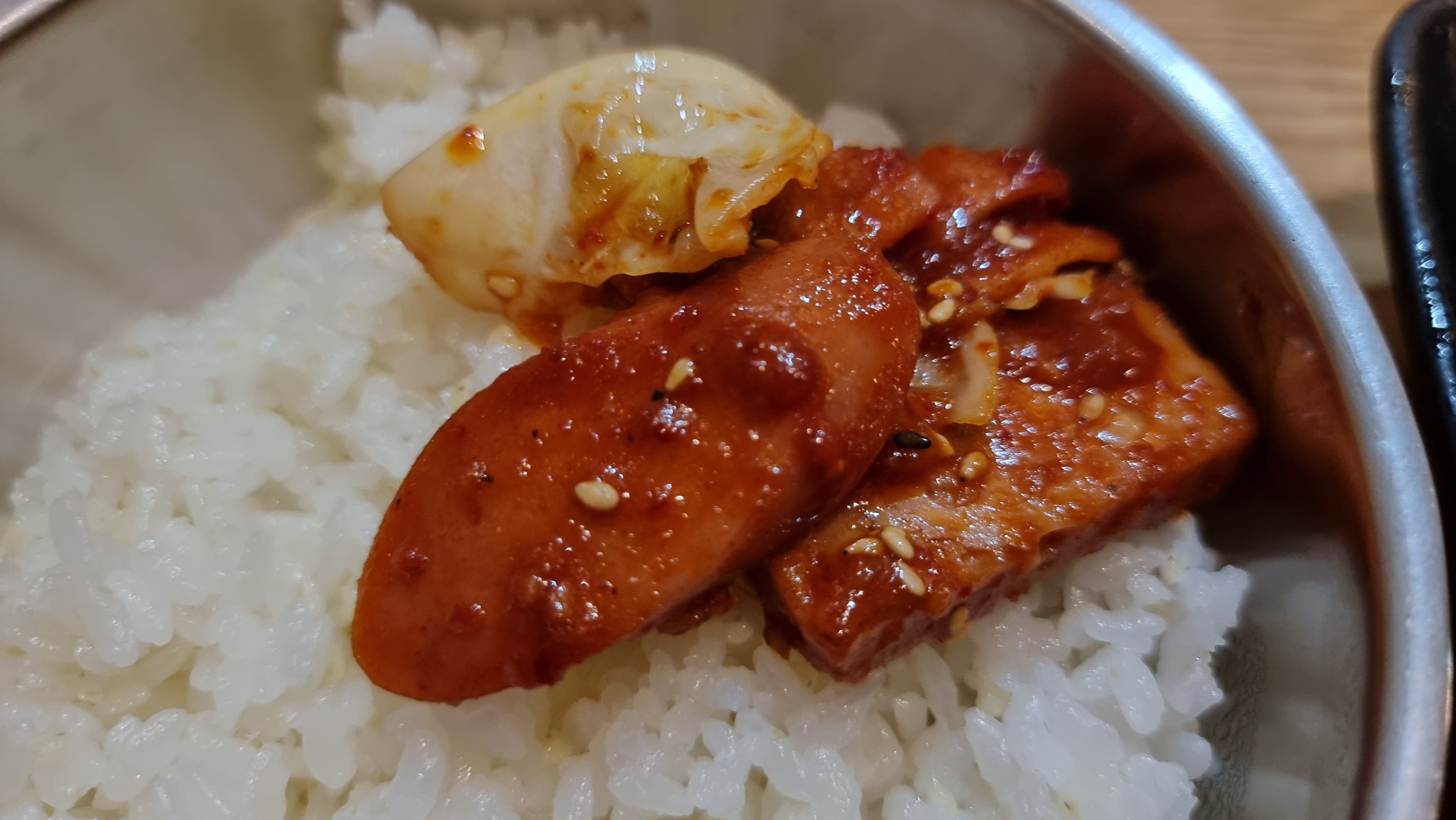 밥위로 철판 부대볶음을 덜어담아 올려주고..