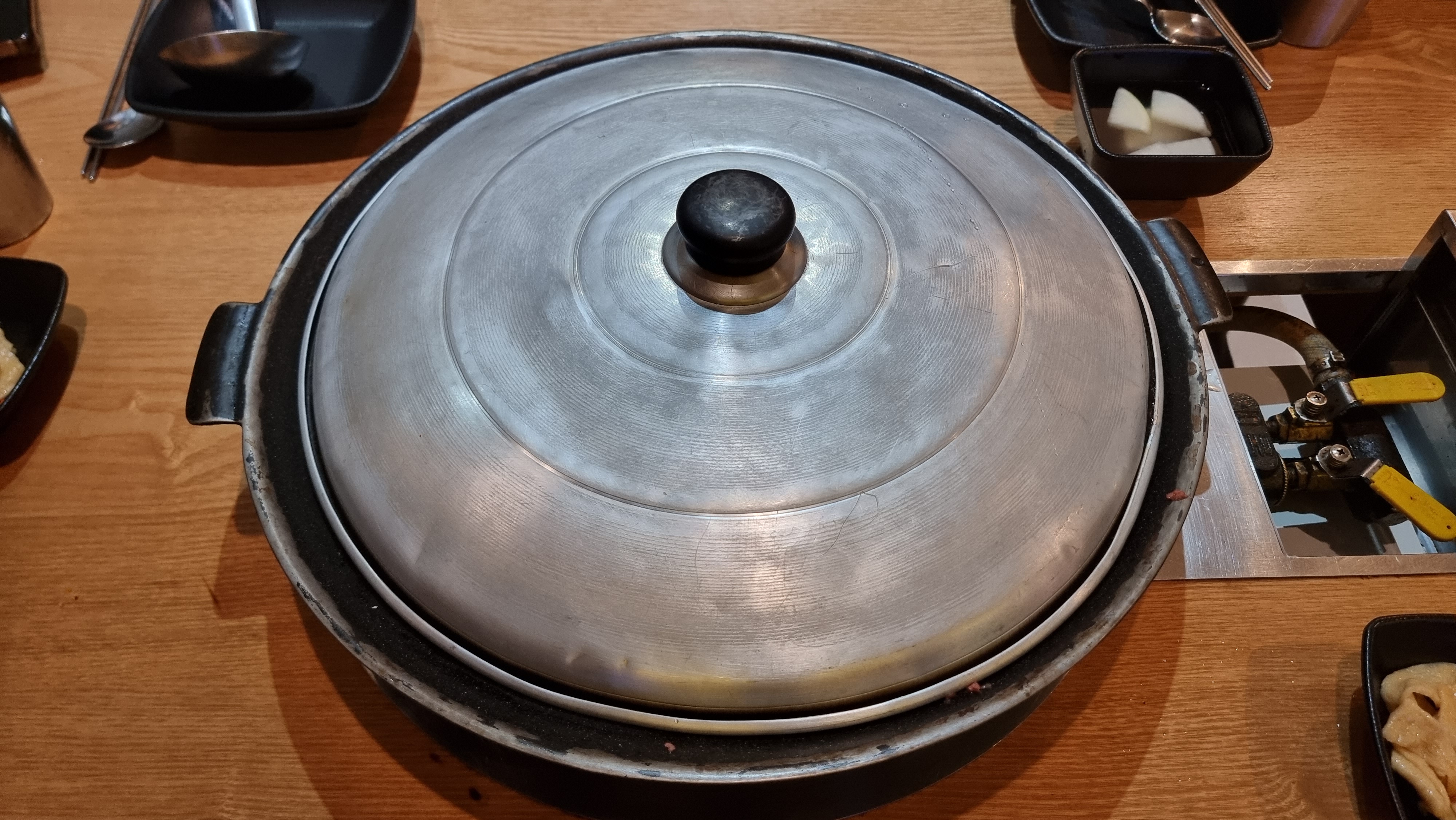 화구위에 무쇠냄비를 올리고 육수를 부어주고 아주 센 화력으로 뚜껑을 덮고 끓여줍니다.