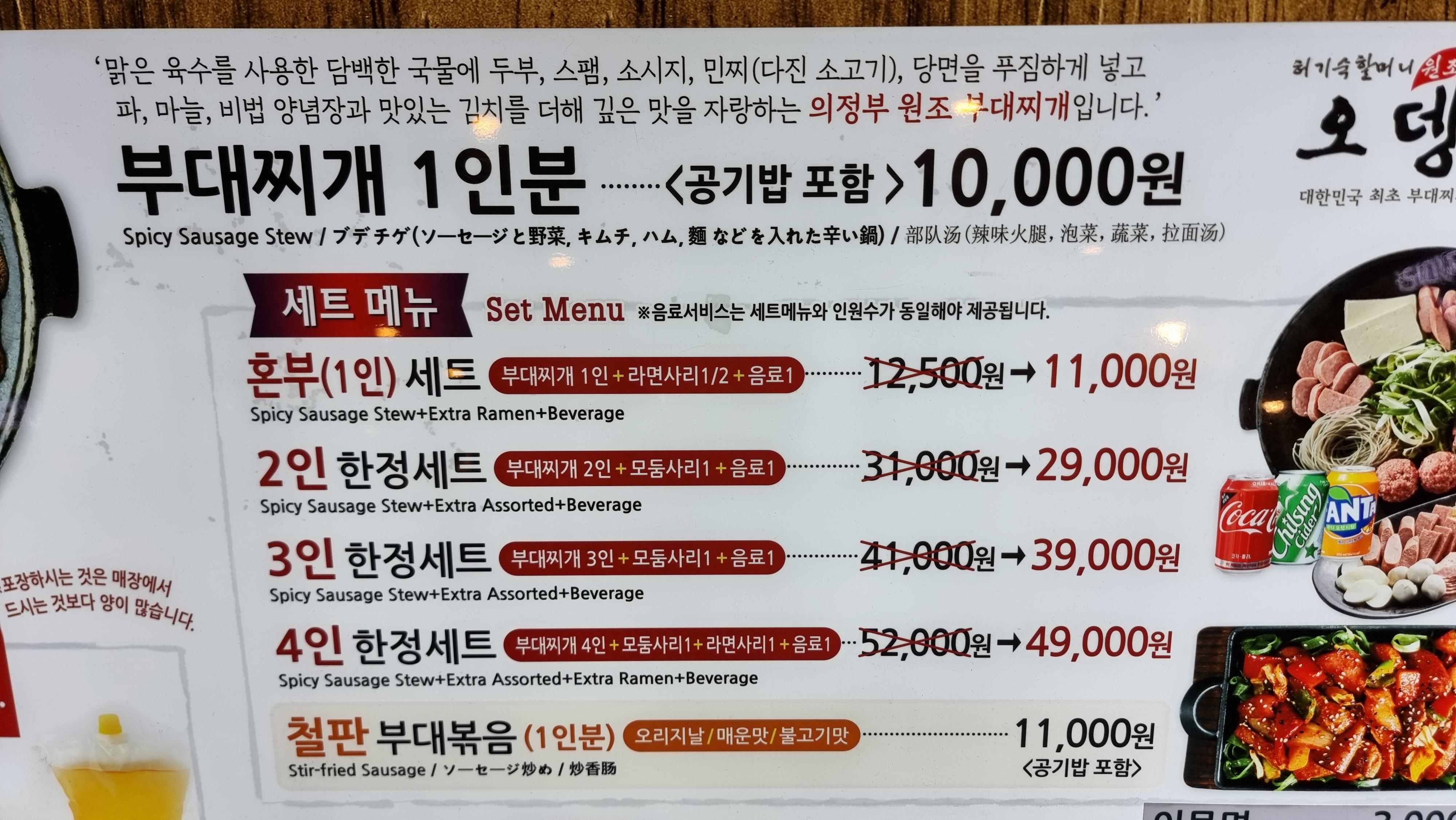 부대찌개와 사리가 그리고 음료가 포함된 세트 메뉴도 있습니다.