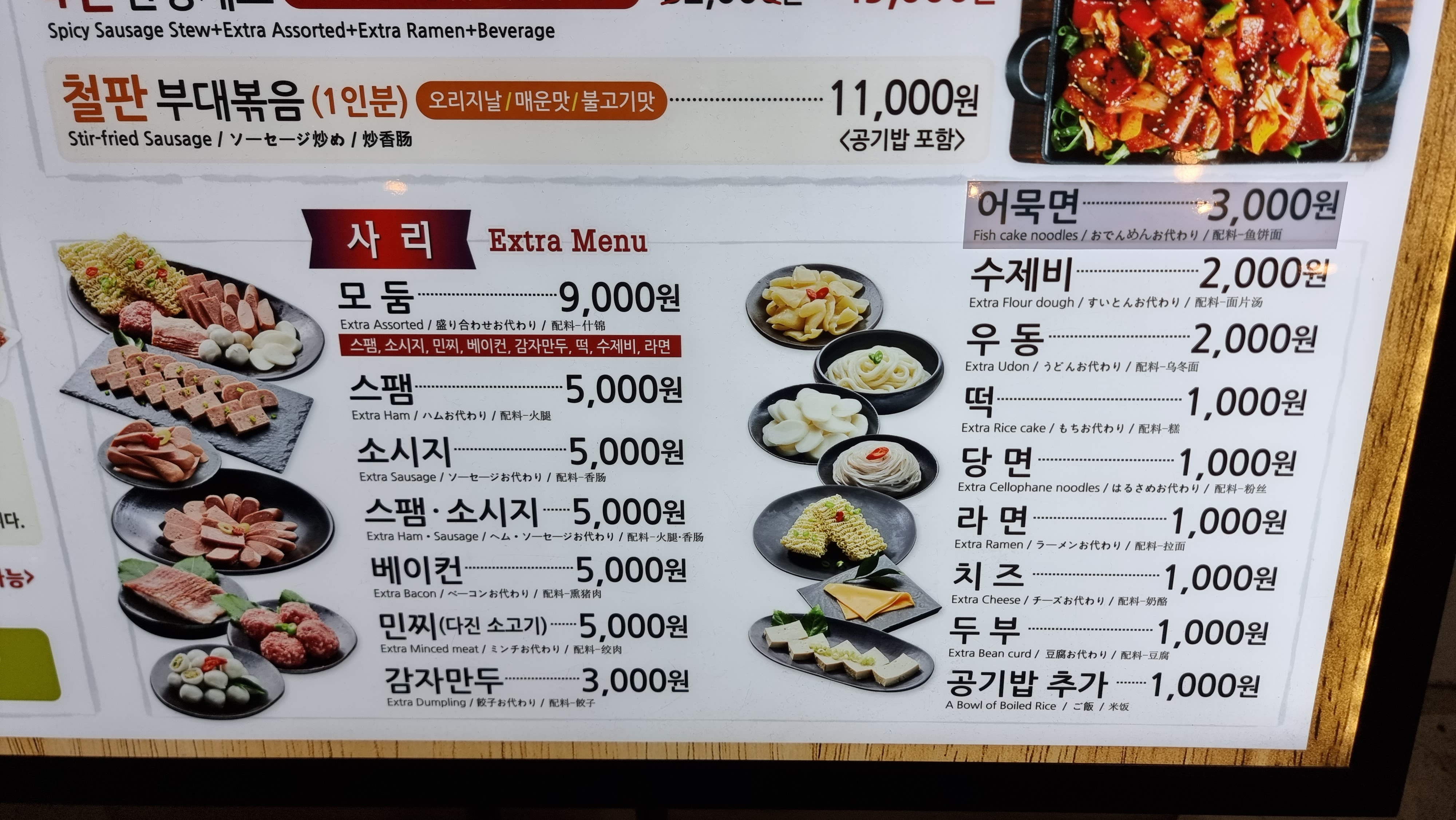 부재찌개 외에 철판 부대볶음이 있습니다. 오리지날/매운맛/불고기맛 선택이 가능합니다.