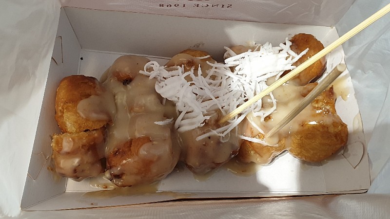튀긴 도넛에 코코넛 크림과 채를 잔뜩 올려준..