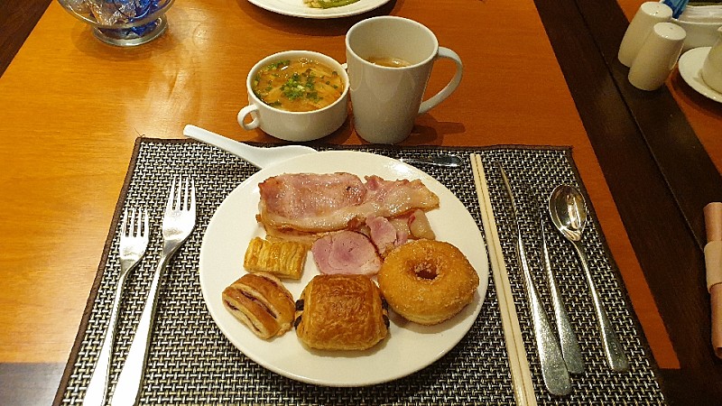 (베이컨, 도너츠와 데니쉬 패스츄리외 빵들을 김치를 넣은 미소국이랑 함께한..)