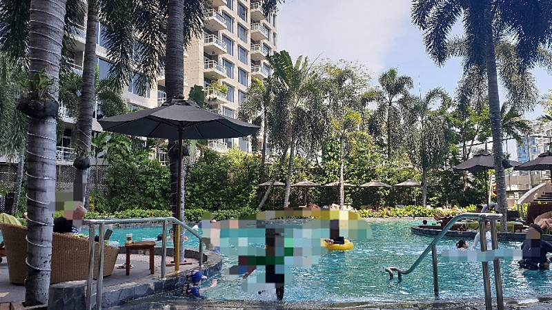 객실로 돌아가 수영복으로 갈아입고 수영장으로 내려 왔습니다.
