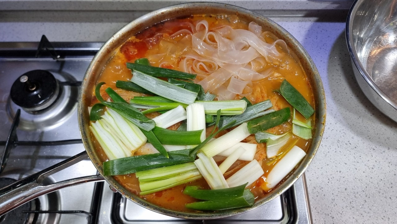 그릇에 김치와 돼지갈비 그리고 납작당면과 대파를 옮겨담아주고 국물을 살짝 부어줬습니다.