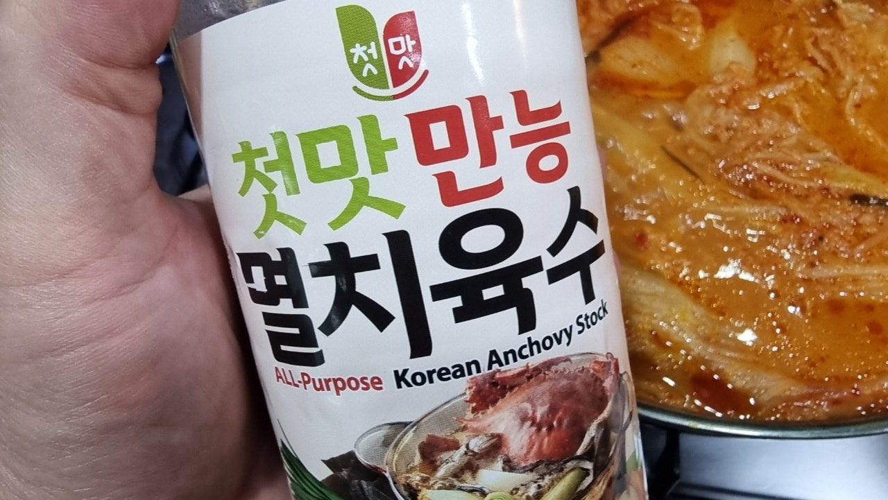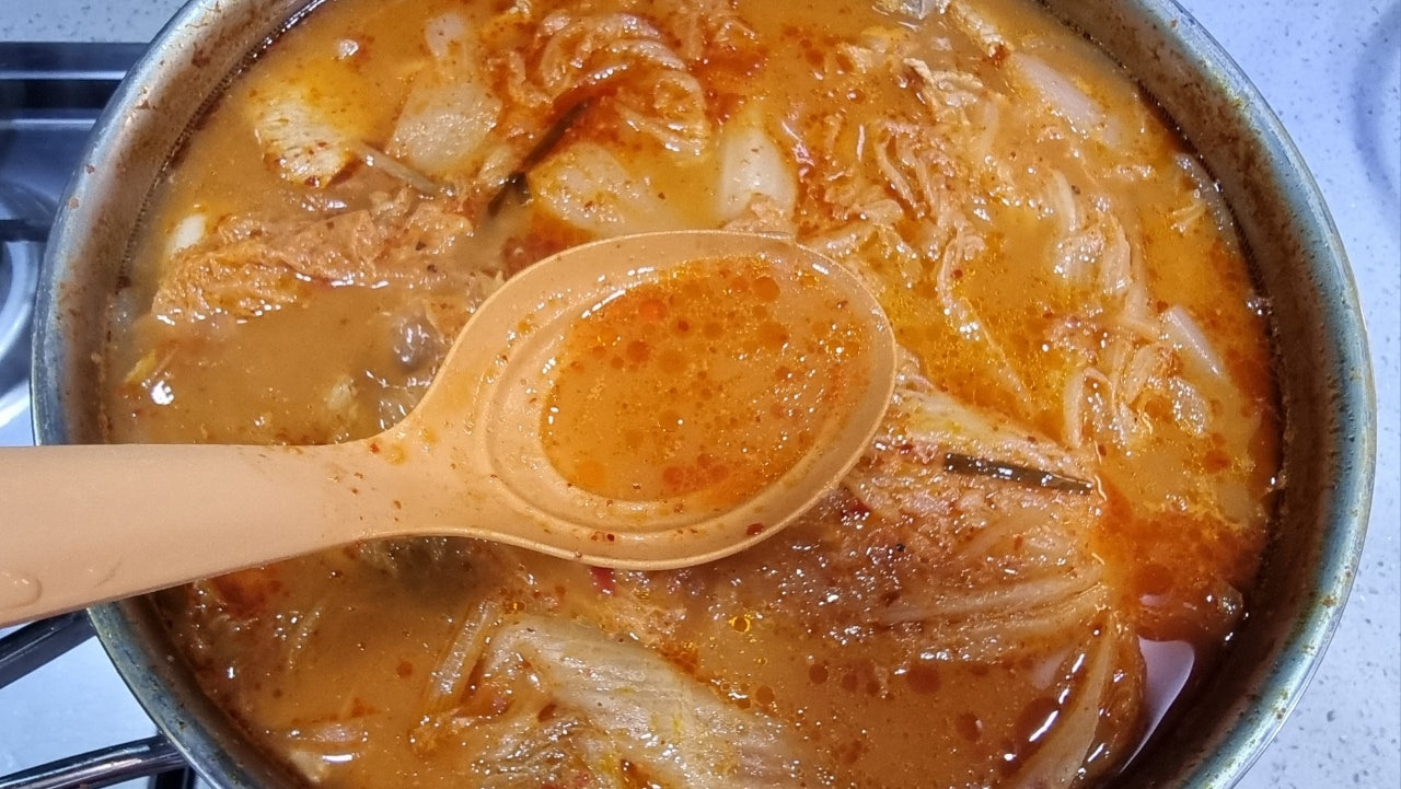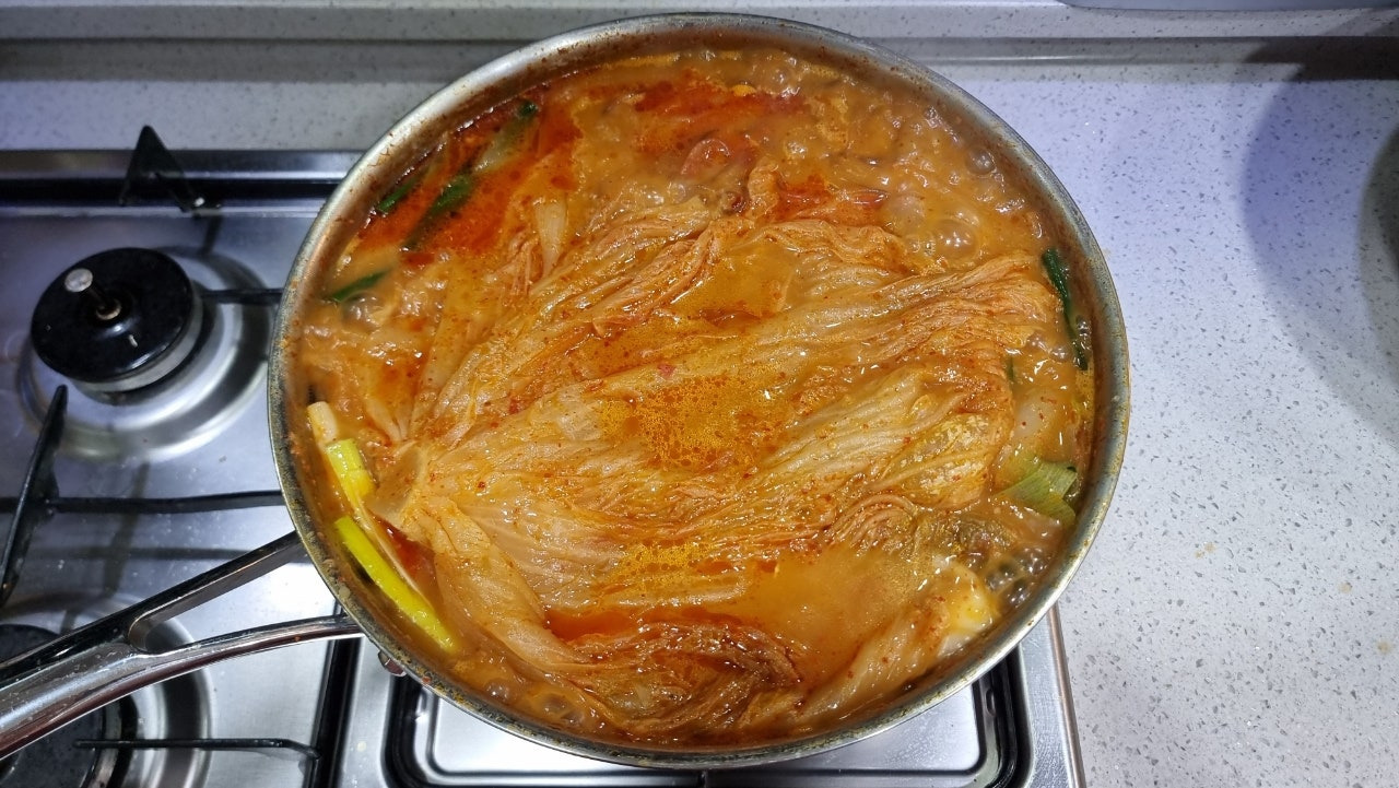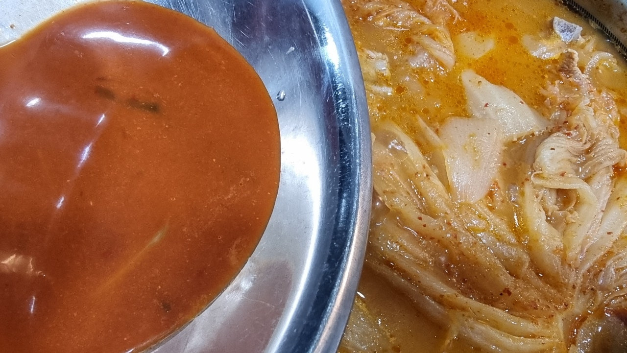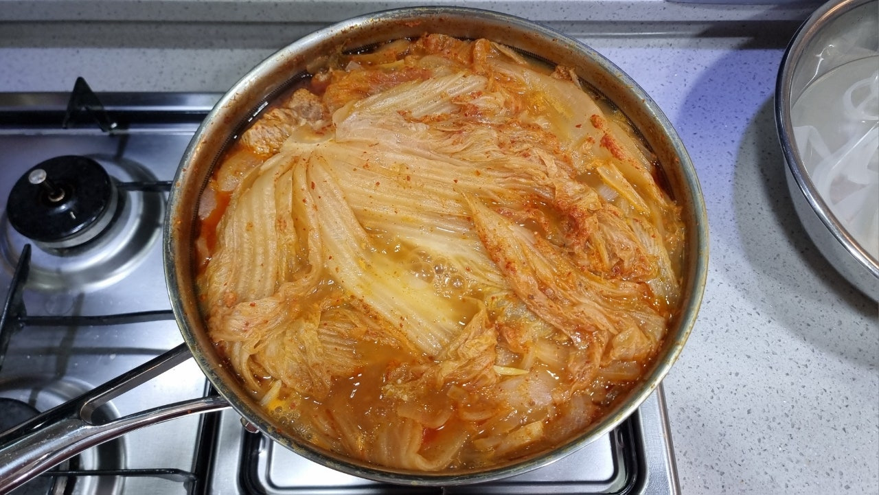 서울식 김치를 사용해서 시원하고 개운한 국물맛이긴 하지만 김치의 시큼한 맛이 부족한 편이라 김치 국물을 한 국자 반 대략 150ml 정도를 웍에 넣고 조리해줬습니다.