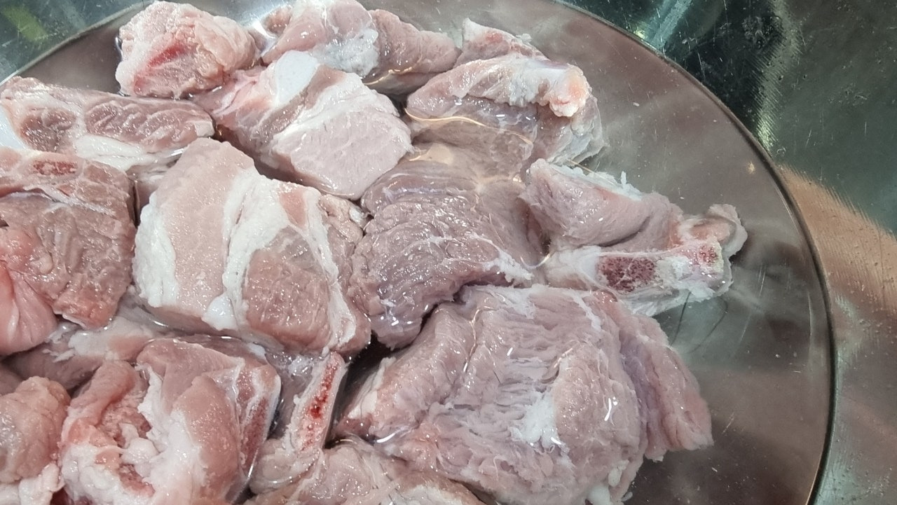 물을 두 세 번 갈아주고 한 시간 이상 핏물을 뺀 돼지갈비 입니다.