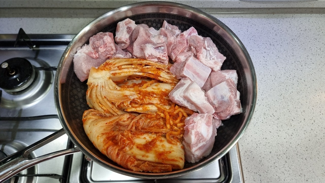 일단 웍에 김치와 돼지갈비를 넣어줬습니다.