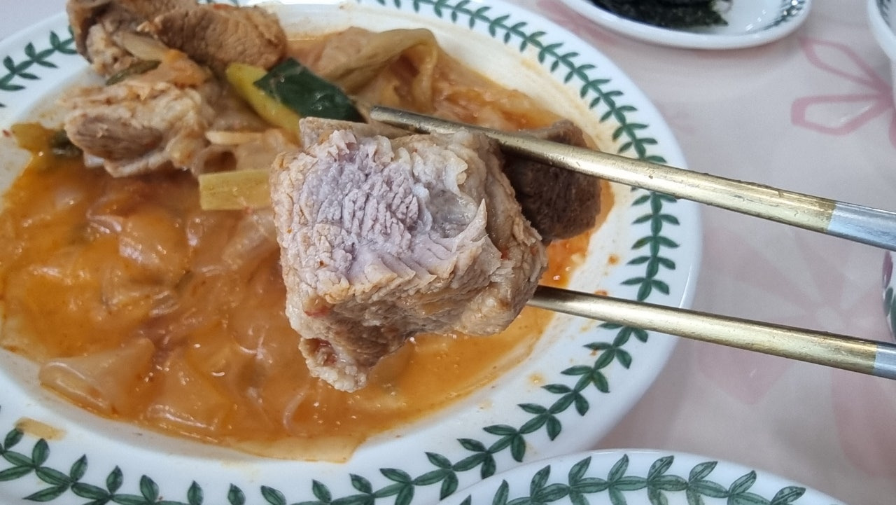 큼직하게 썰린 찜용 돼지갈비를 그대로 넣어서 볼륨감을 살린채로 조리해 줬습니다.
