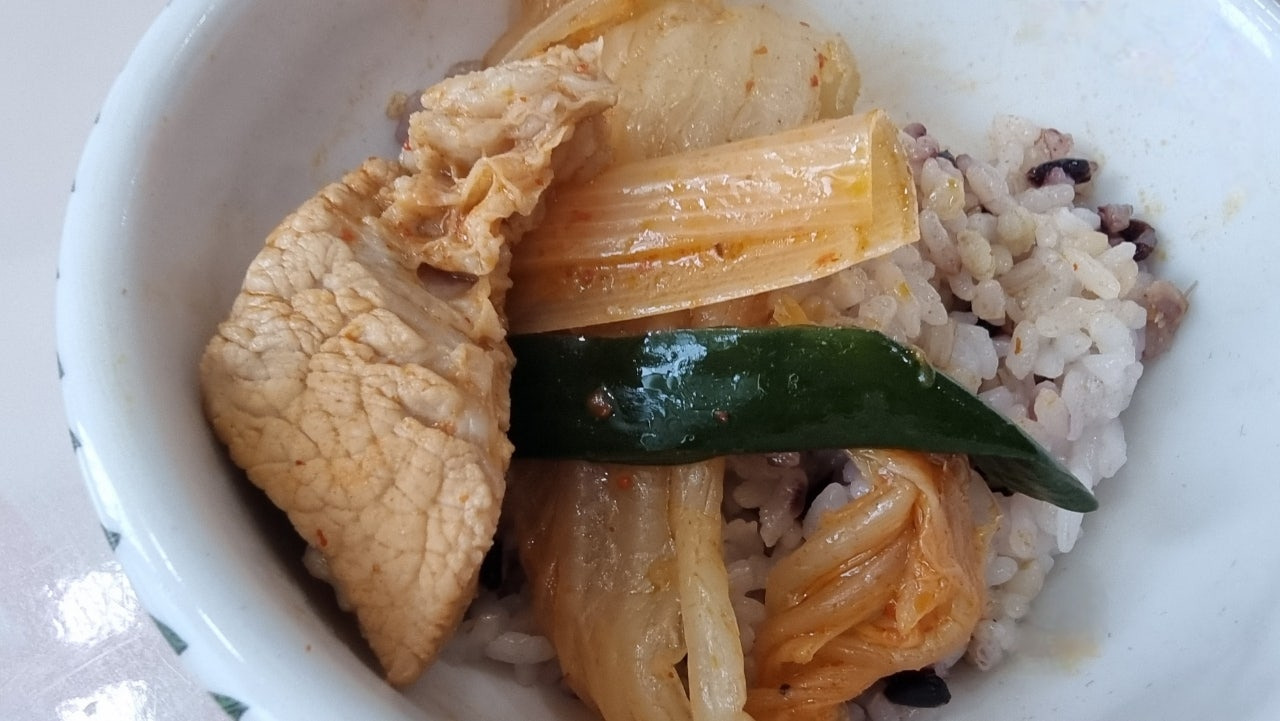 갈빗살과 김치와 대파를 밥 위에 올려서 크게 한 입...
