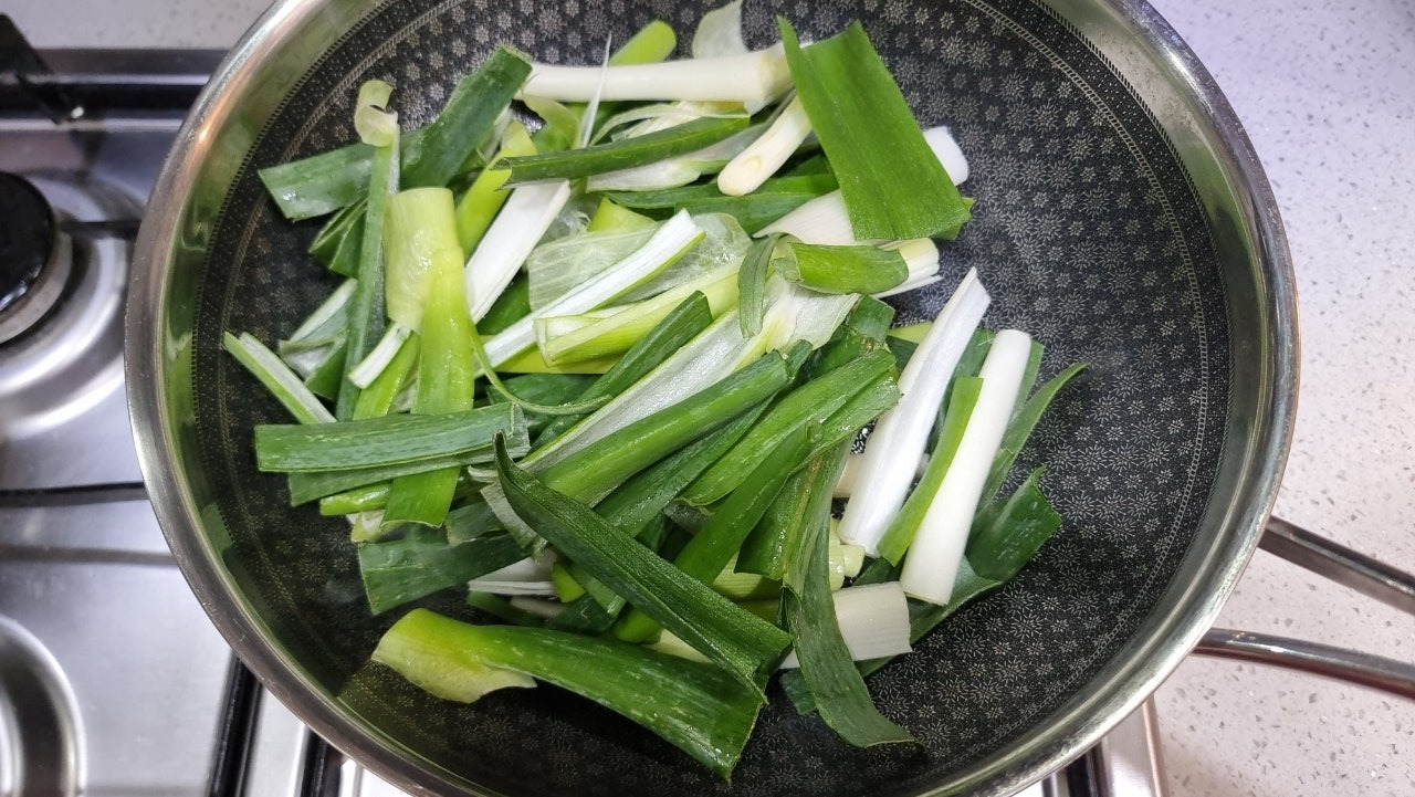 주걱으로 잘 저어가며 대파를 식용유에 볶아줍니다.