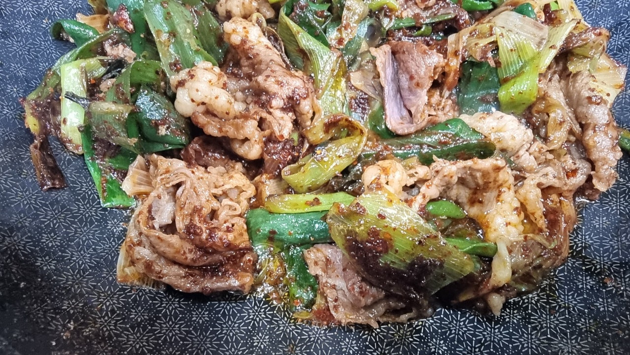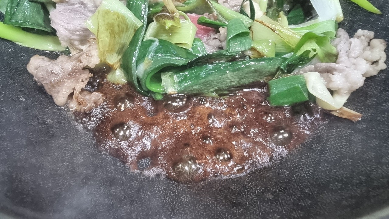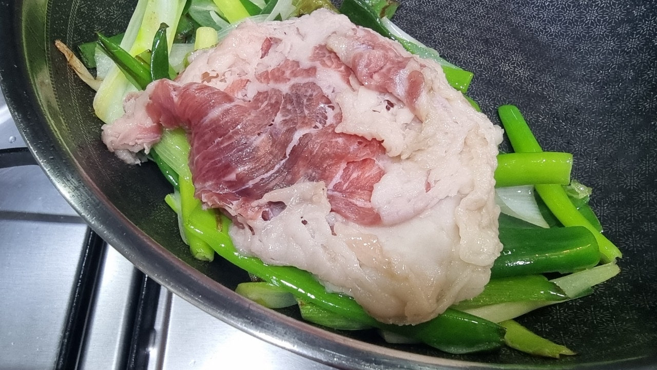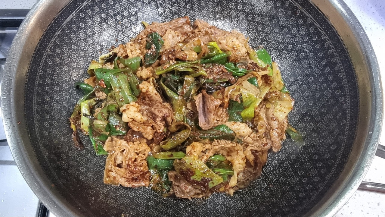 대파 겉면에 살짝 탄자국이 생기고 숨이 죽었을 무렵에 찬물에 해동시켜둔 차돌박이를 웍에 넣어주고 대파와 함께 볶아줍니다.