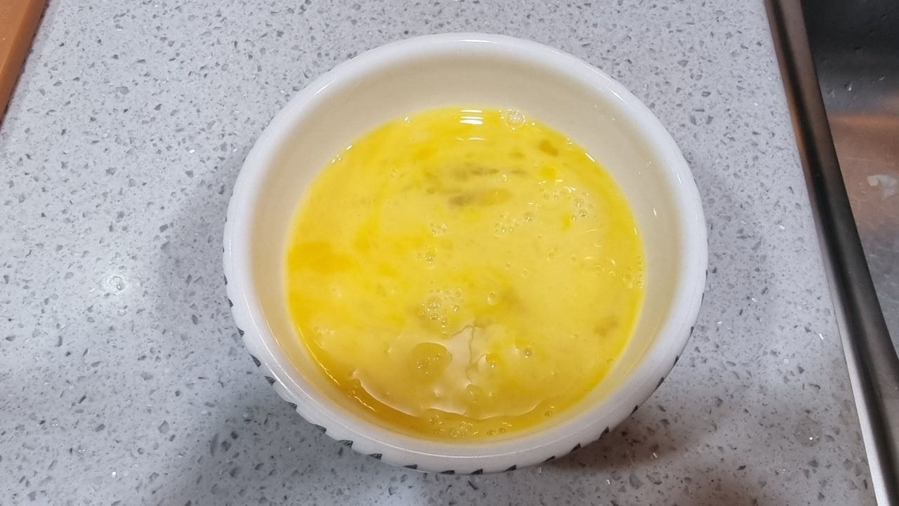 계란 세 알은 그릇에 깨넣고 잘 휘저어 뒀습니다.