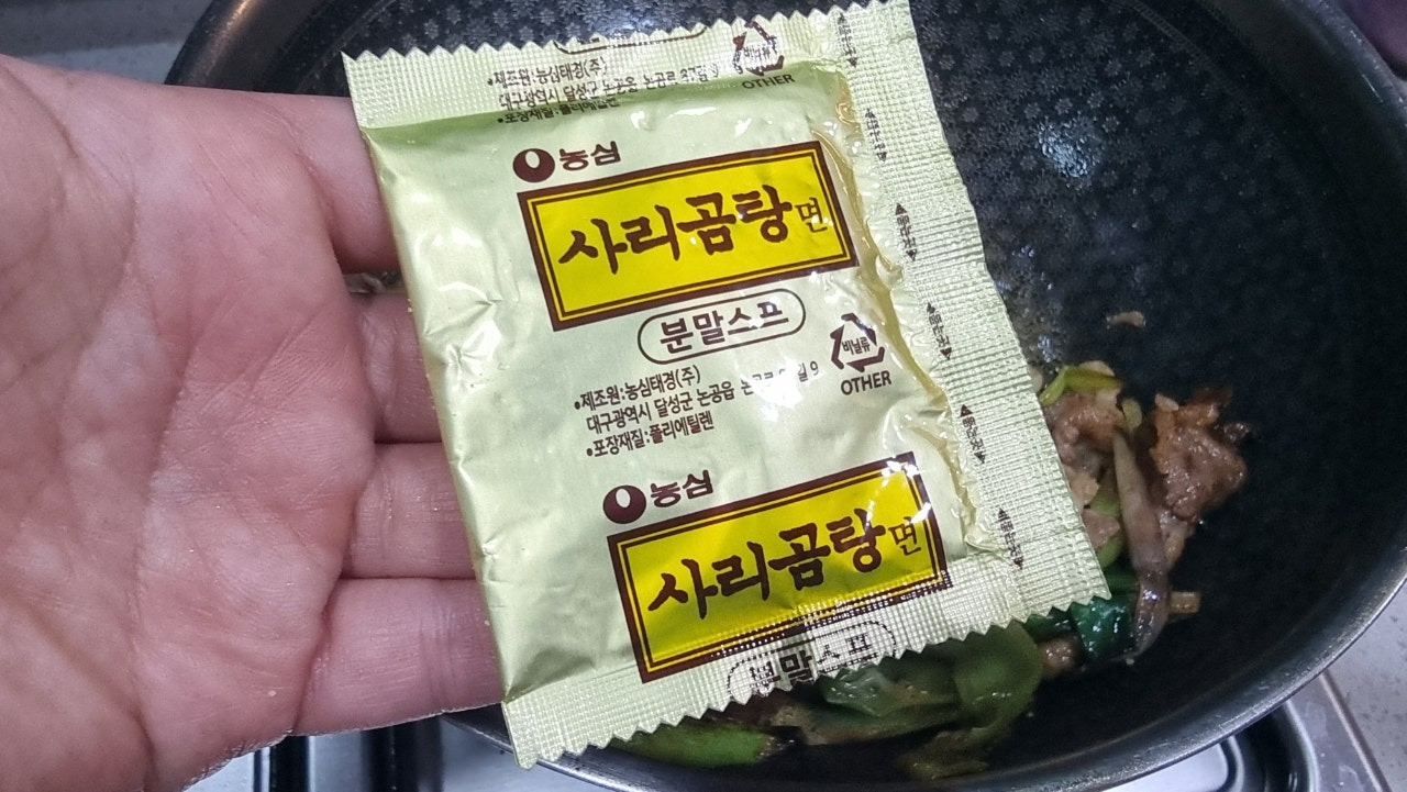 물이 끓기 시작하면 사리곰탕면 건더기 스프 세 개와 분말스프 한 개를 웍에 넣어줍니다.