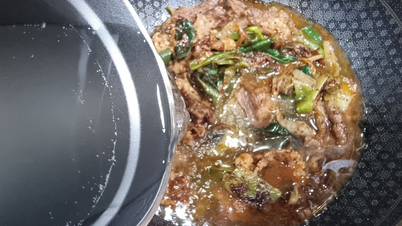 바닥에서 간장을 태워서 향을 내주고 재료들과 섞어줍니다.