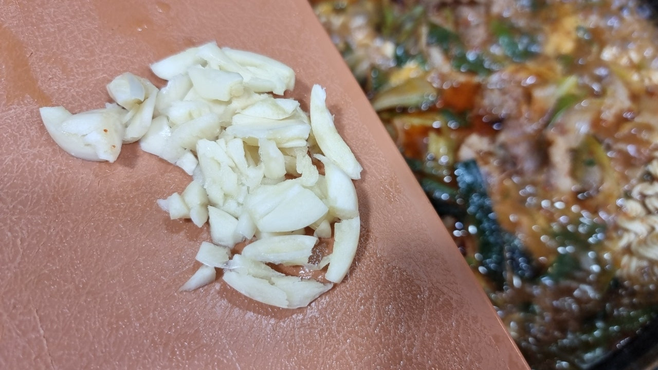 마침 이제는 처분해야 할 대파 세네 줄기 정도가 있어서 사리곰탕면 세 봉지와 차돌박이 200g에 마늘 여섯 쪽 그리고 계란 세 알을 2인분 재료로 준비하였습니다.