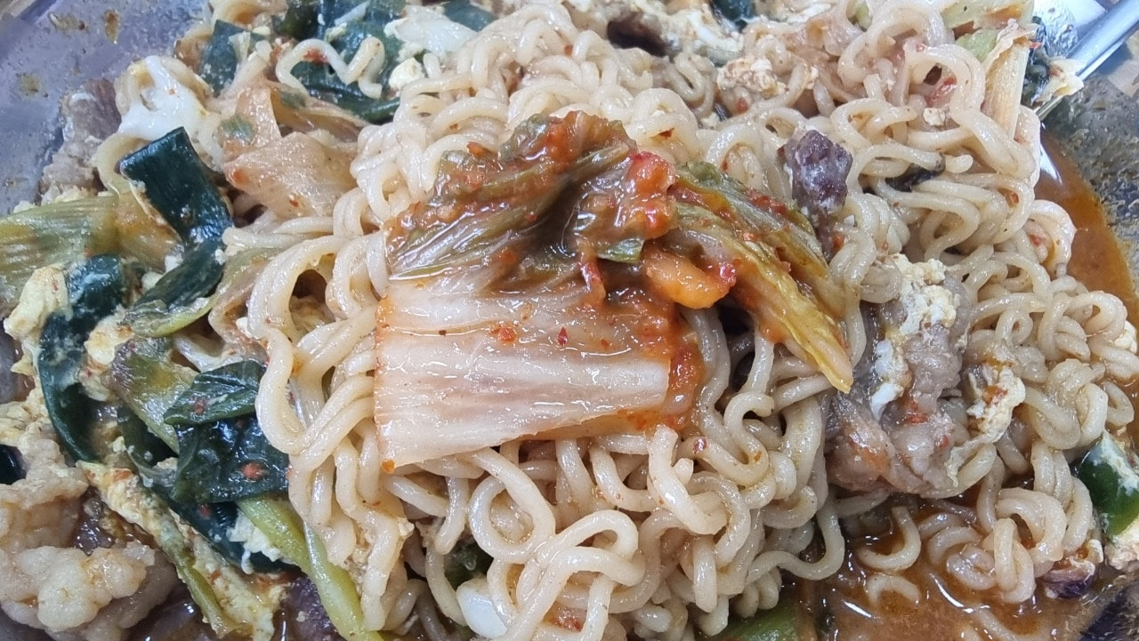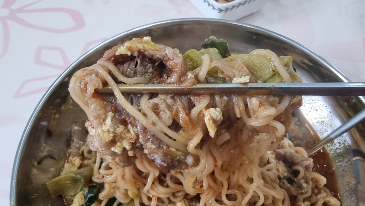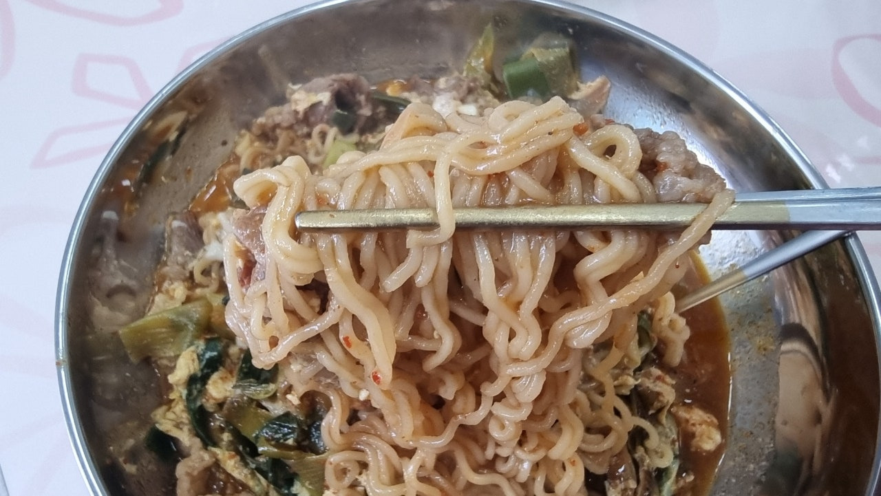 진짜 듬뿍 넣어준 대파와 차돌박이를 면과 함께 푸짐하게 집어들고 또 한 입...