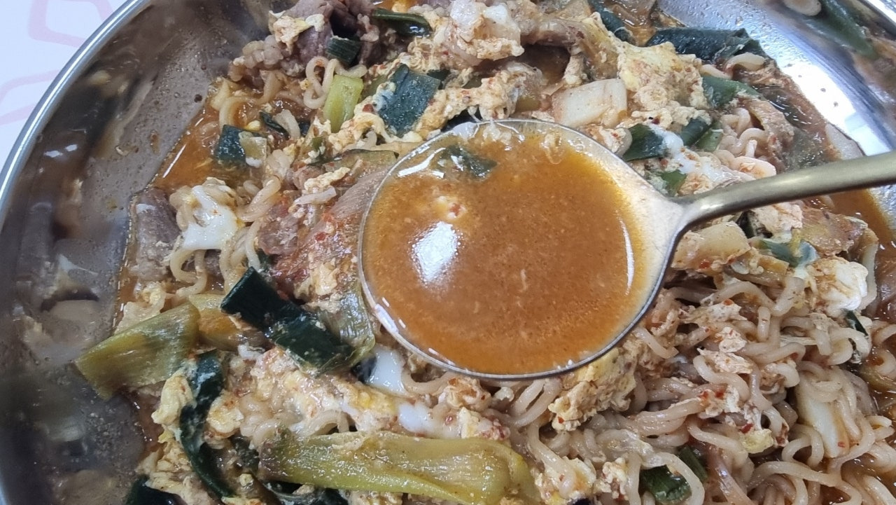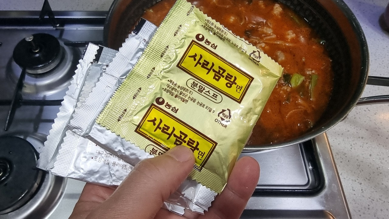 남은 사리곰탕면 분말스프 반 정도를 넣고 제 취향에 맞게 간을 맞춰줬습니다.