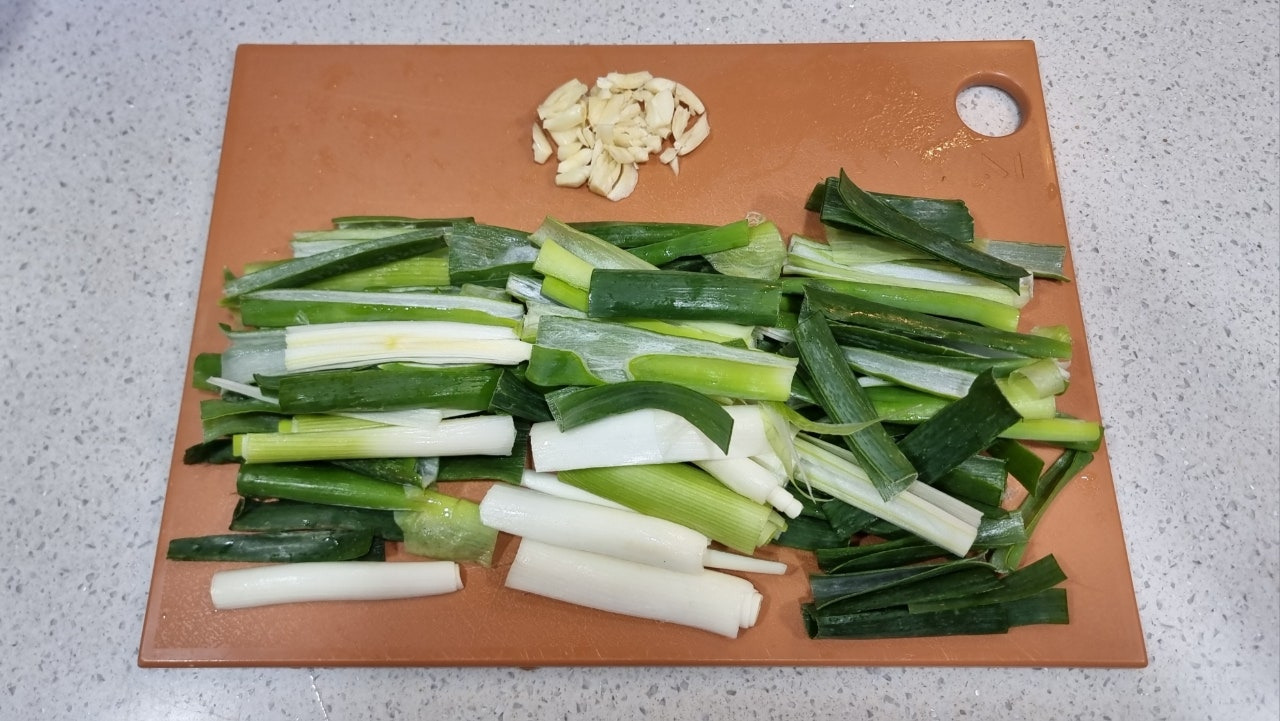 대파는 검지 손가락 길이 정도 길이로 잘라서 반 갈라두고 마늘은 꼭지를 잘라버리고 으깨 둡니다.