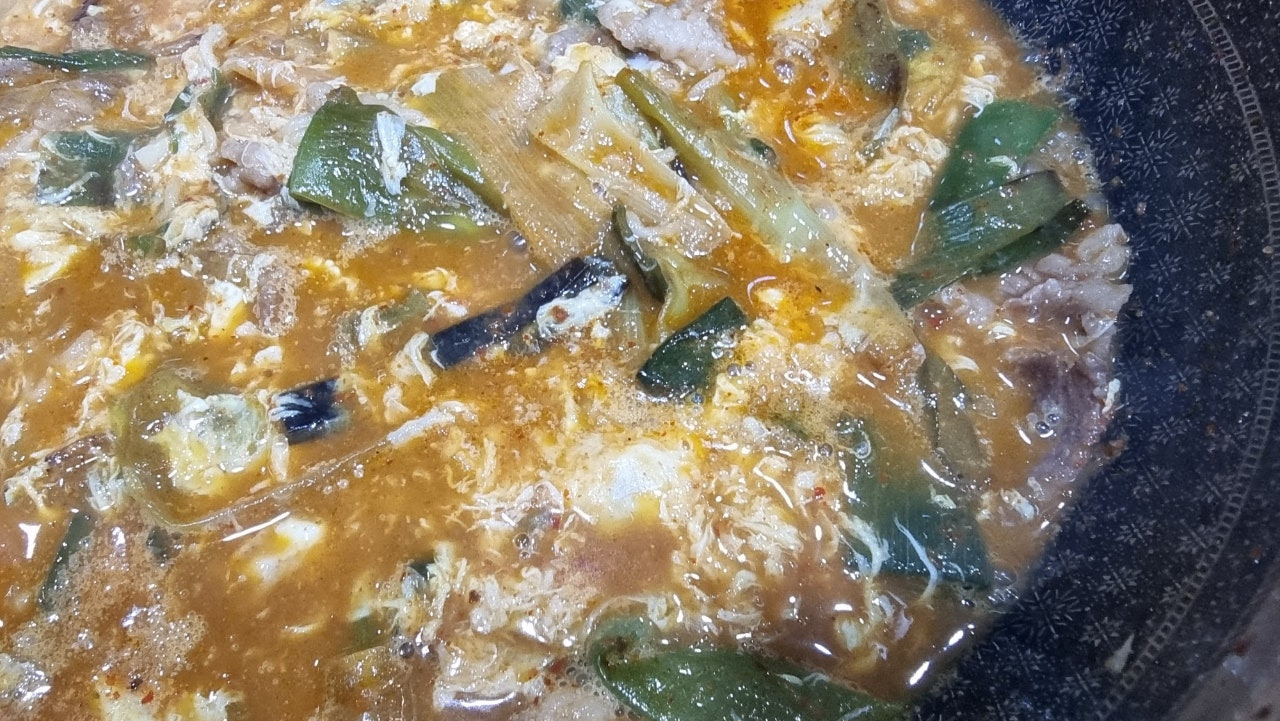 웍에서 끓고있는 국물위로 계란물을 둘어 부어주고 30초 정도 살짝만 더 끓여줍니다.