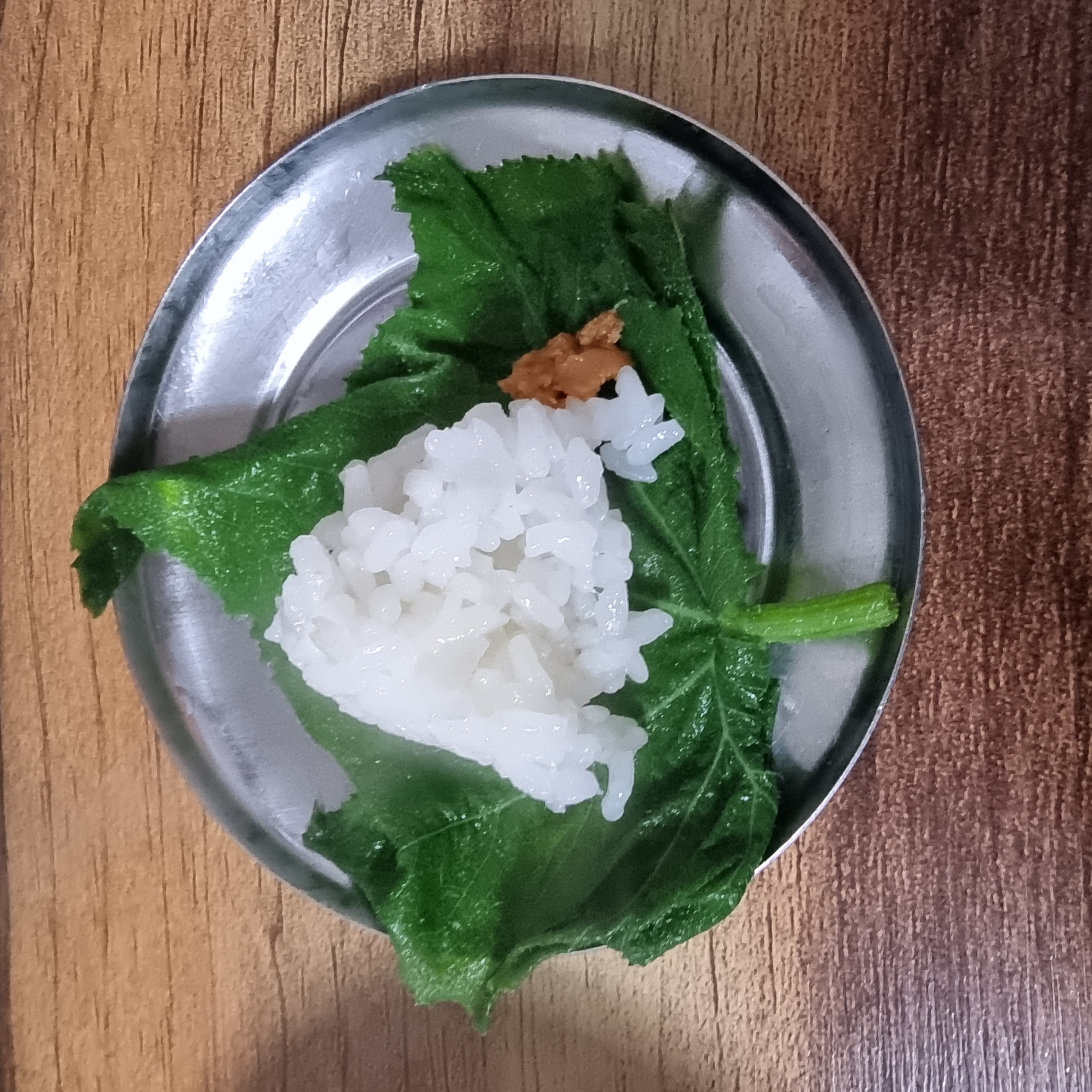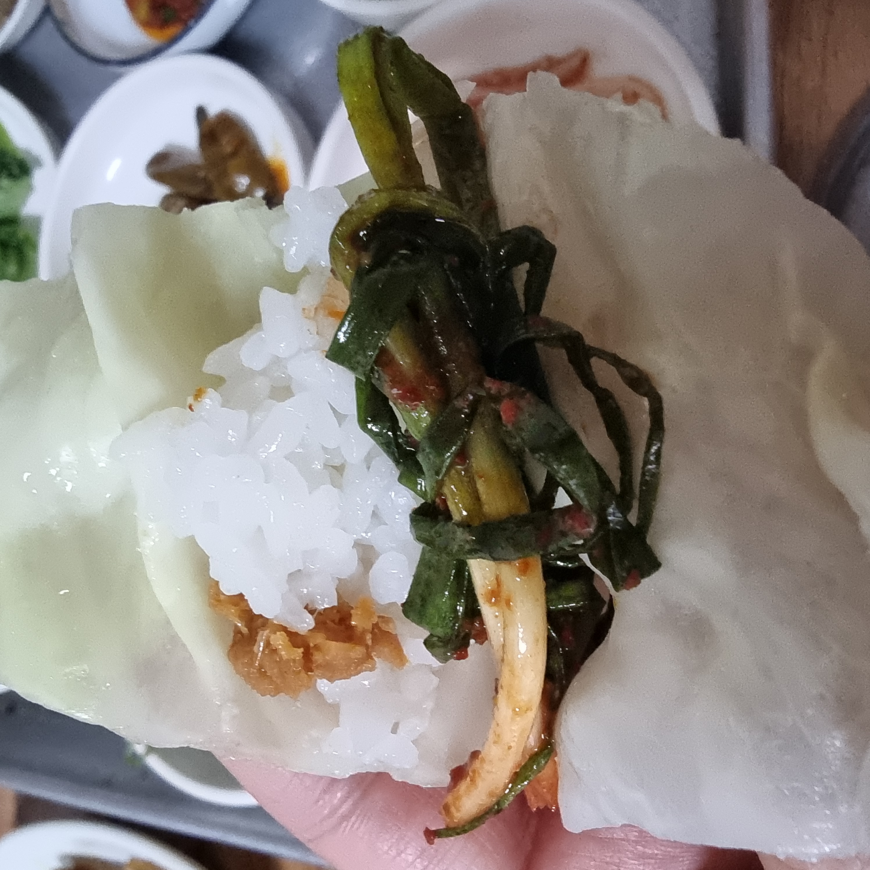 첫 한 입은 애호박 잎으로 밥만 올려주고 쌈을 싸먹고...
