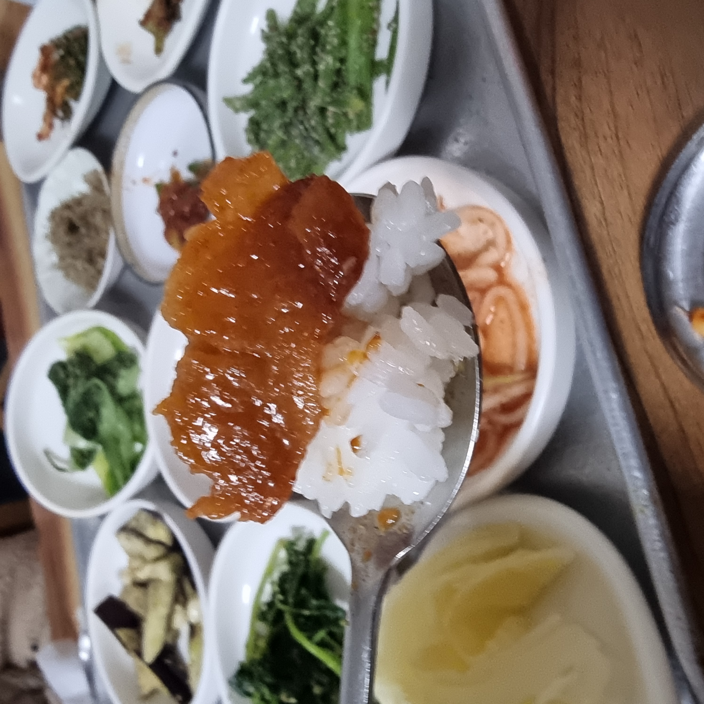 눈길을 끄는 애호박 쌈, 갓김치 그리고 토란대 무침이었습니다.