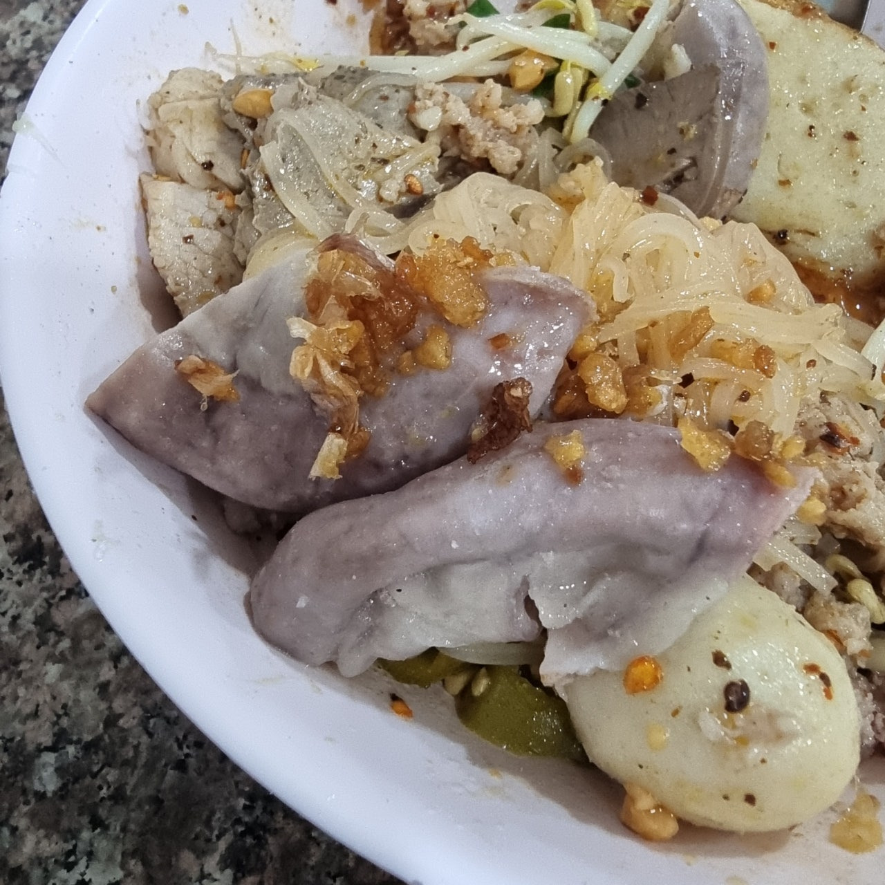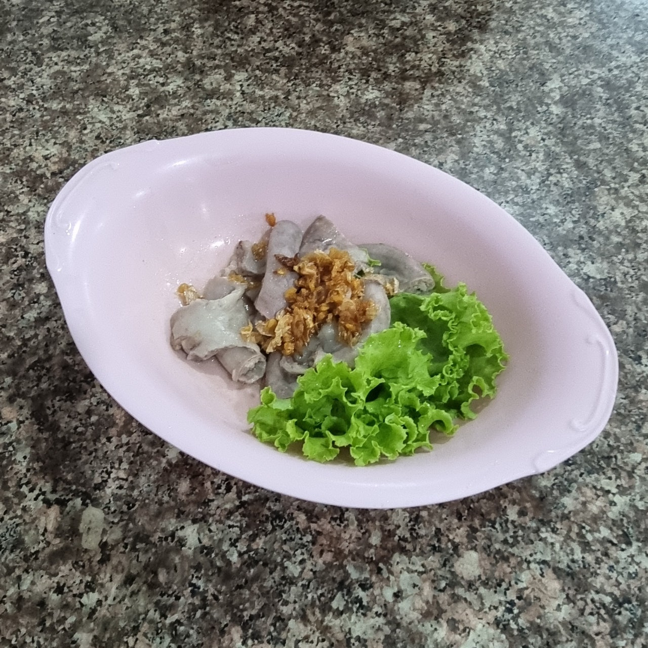 돼지 내장에는 튀긴 샬롯과 마늘이 올려져서 나와서 풍미를 끌어올려줍니다.