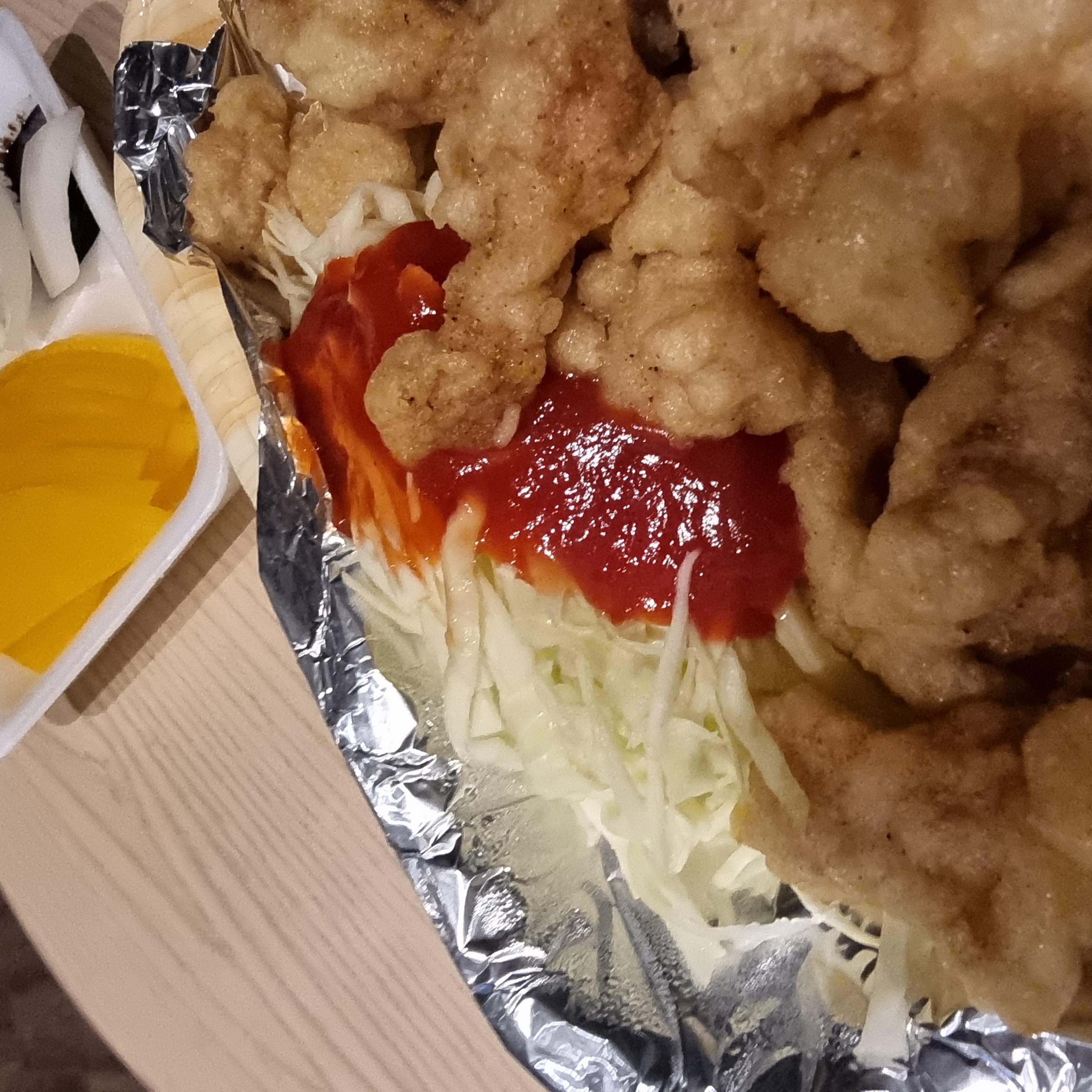 탕수육에 함께 담겨진 양배추 케첩 샐러드...