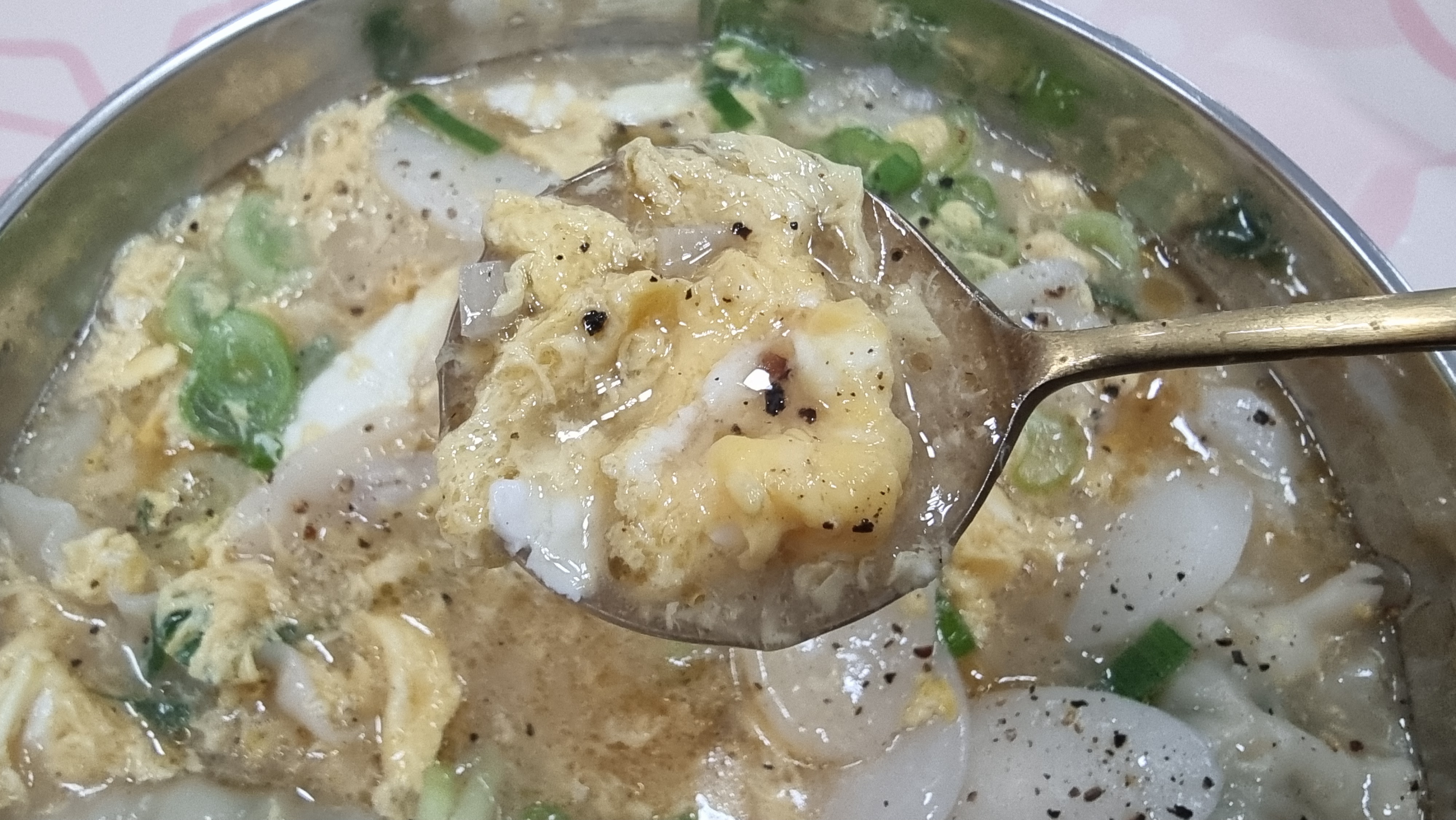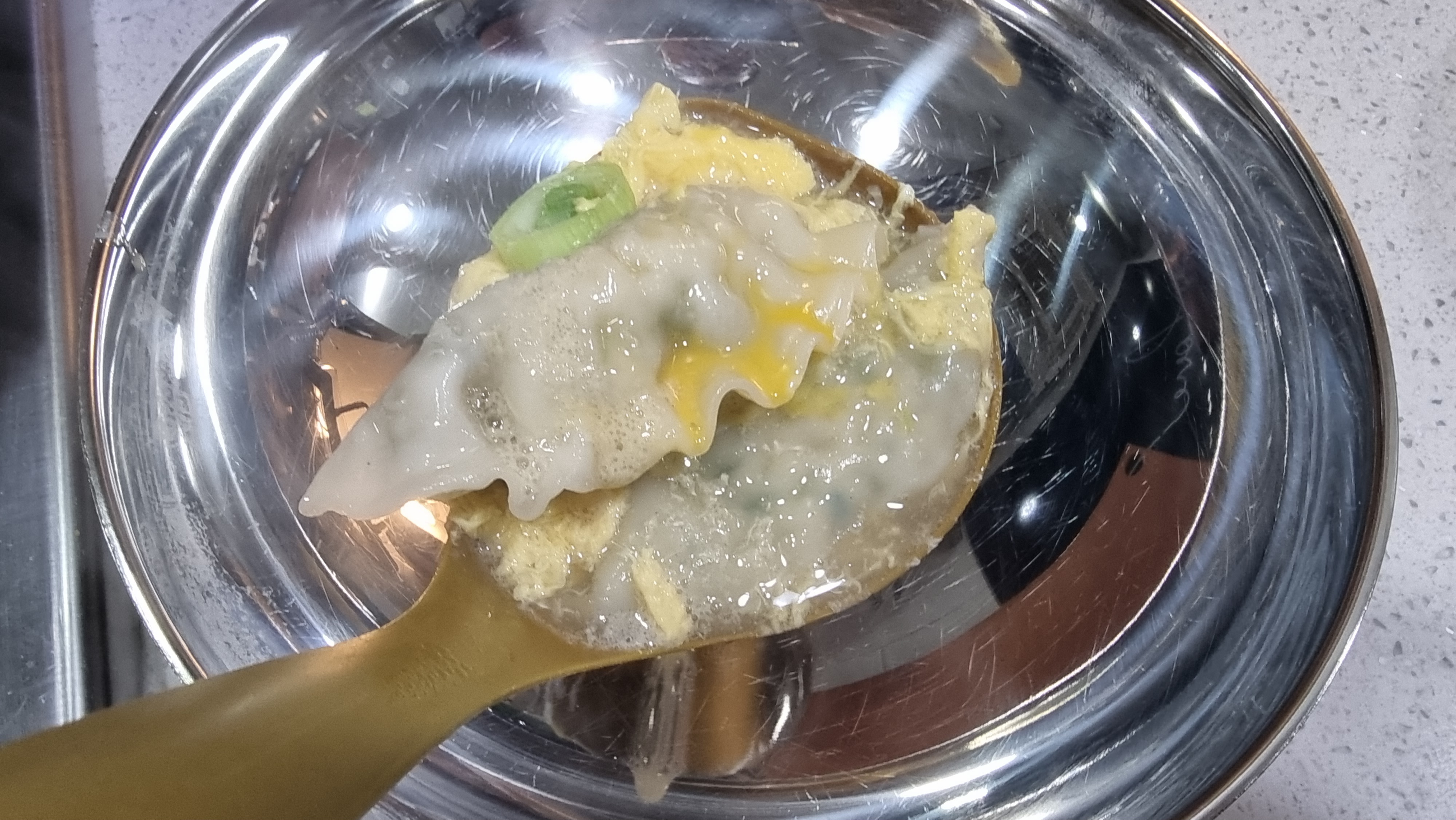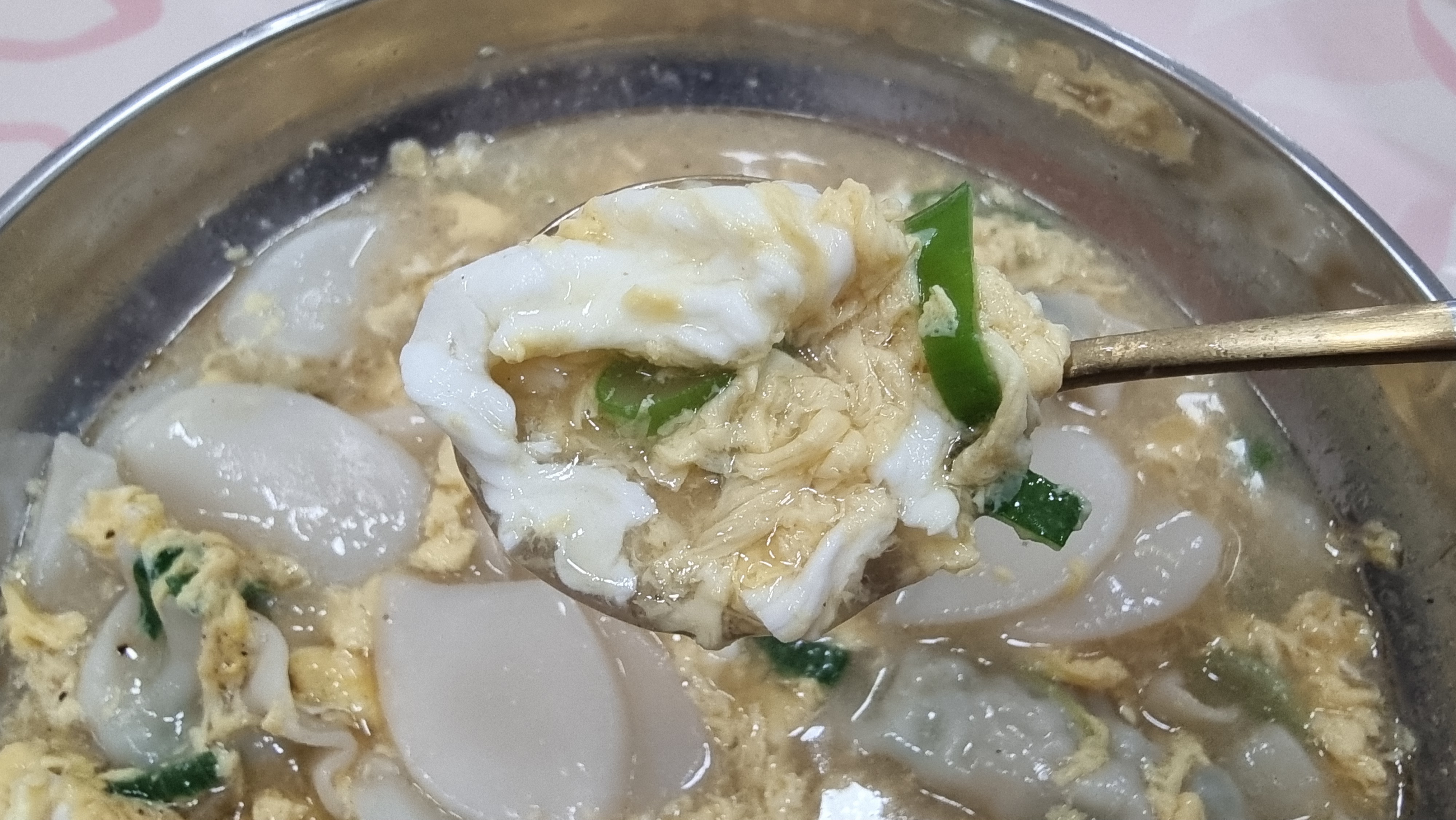 계란을 듬뿍 떡만둣국 국물과 함께 떠서 한 입...
