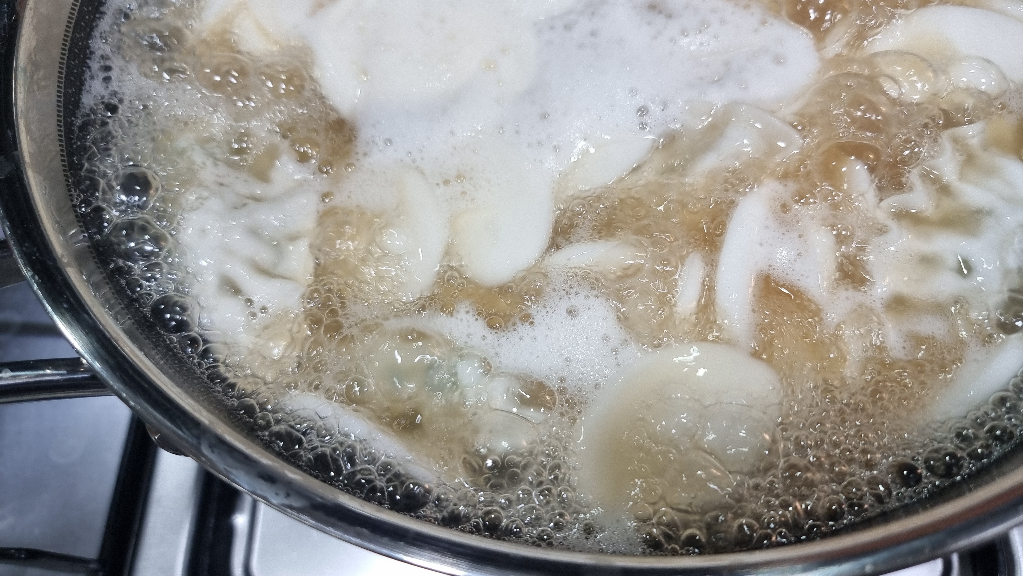 찬물에 30분 이상 불려둔 떡국떡을 먼저 끓는물에 넣어주고...