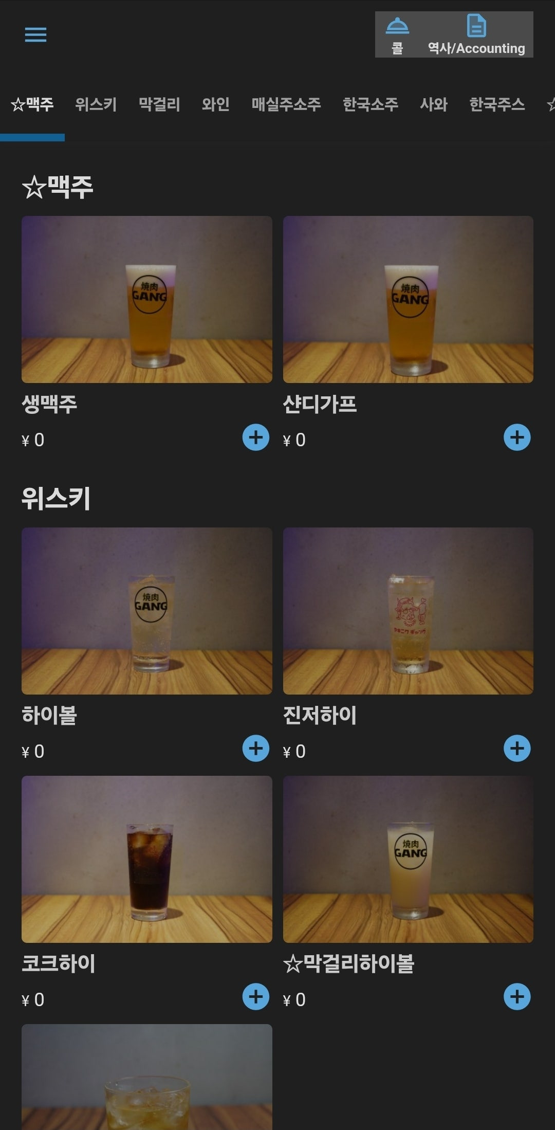 맥주, 위스키, 막걸리, 와인, 매일주소주, 한국소주, 사와 등등...