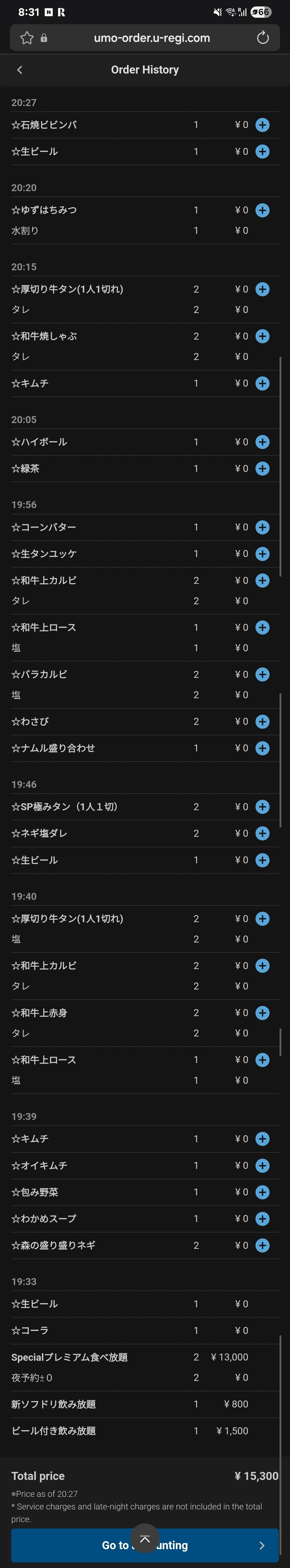 이렇게 먹고 서비스 비용 포함 16,065엔이 나왔습니다.