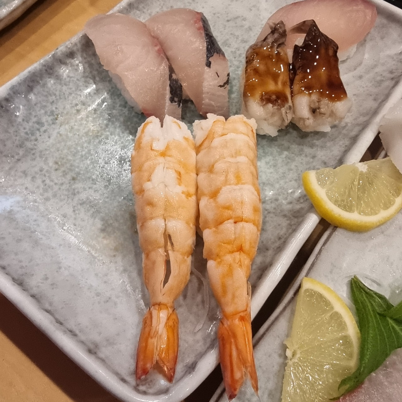 그리고 관자, 잿방어, 참치 중뱃살, 활새우 초밥입니다.