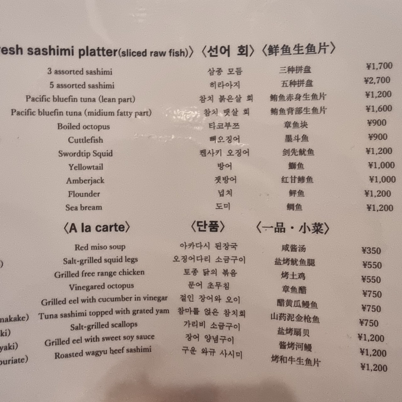 회 종류가 있냐고 여쭤보니 메뉴판을 가져다 주셨습니다.