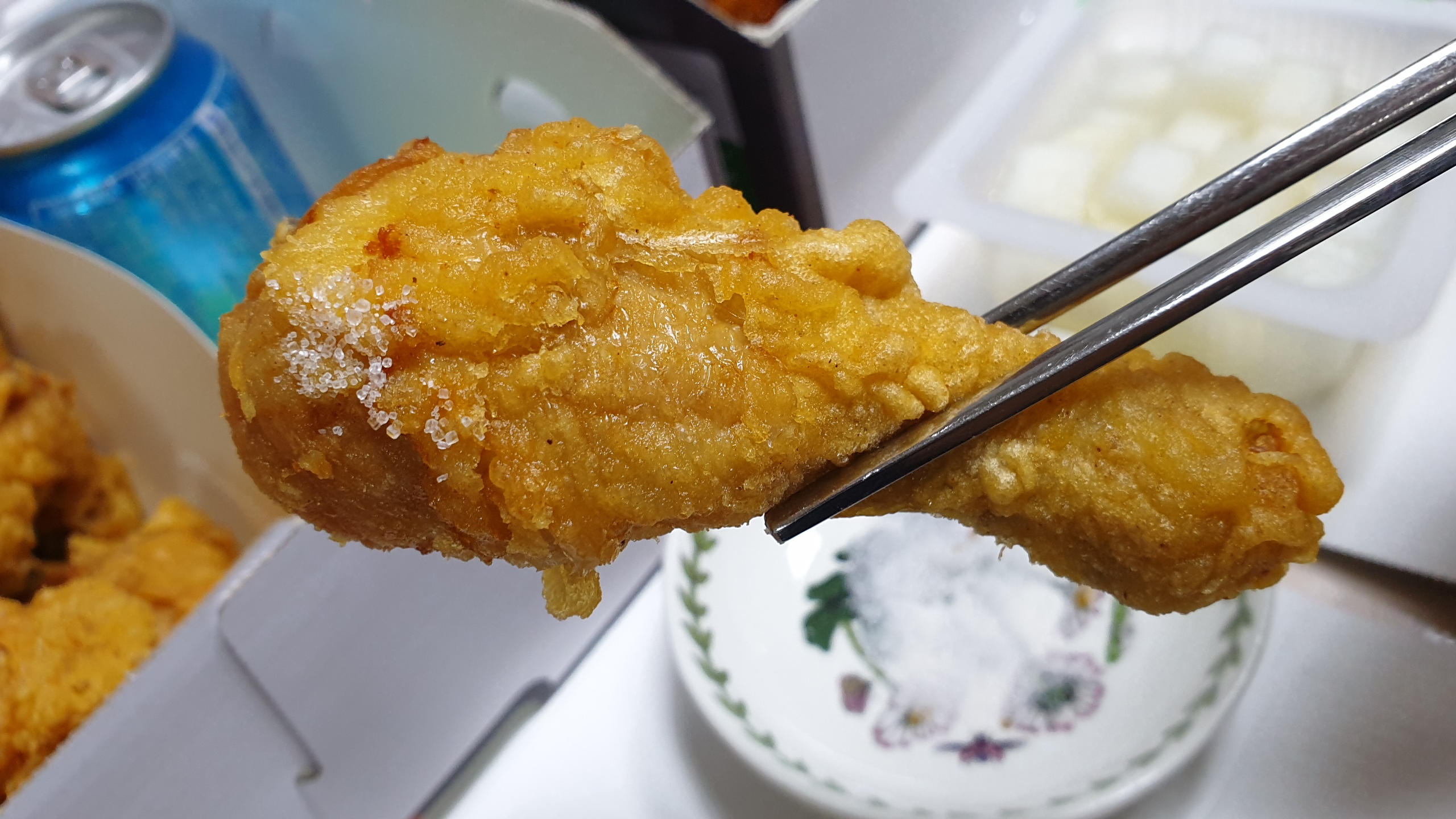 나쁘지 않은 기름맛이 느껴지는 아직 온기가 있는 후라이드치킨은 역시 소금에 찍어먹어야 제맛입니다.