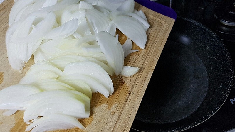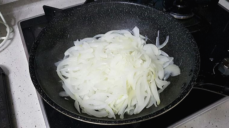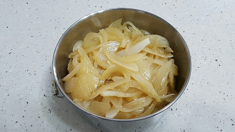 그 위로 미리 볶아둔 양파를 듬뿍 올립니다.