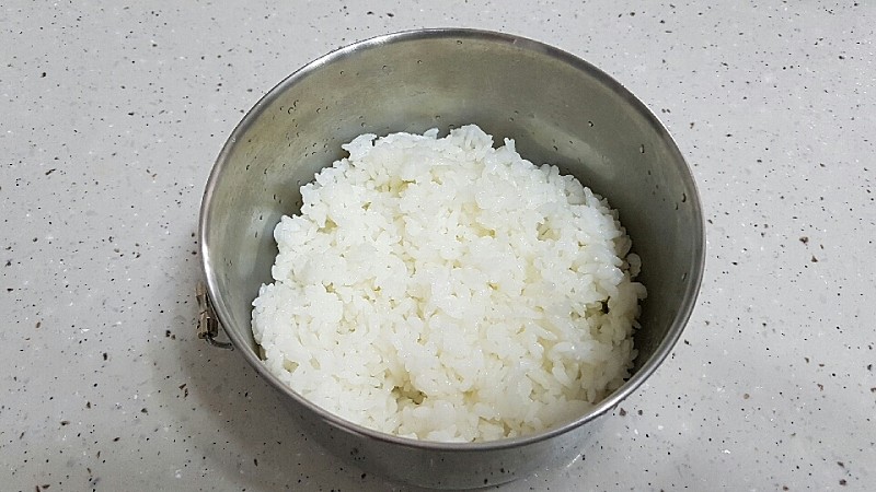그동안 밥그릇에 밥을 먼저 깔아줍니다.