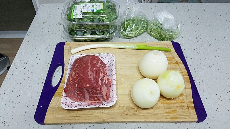 마트에서 사온 새싹순 두팩과 파채 두봉지와 집에있던 양파 세개와 대파 한줄과 함께 안심덮밥 준비를 해봤습니다.