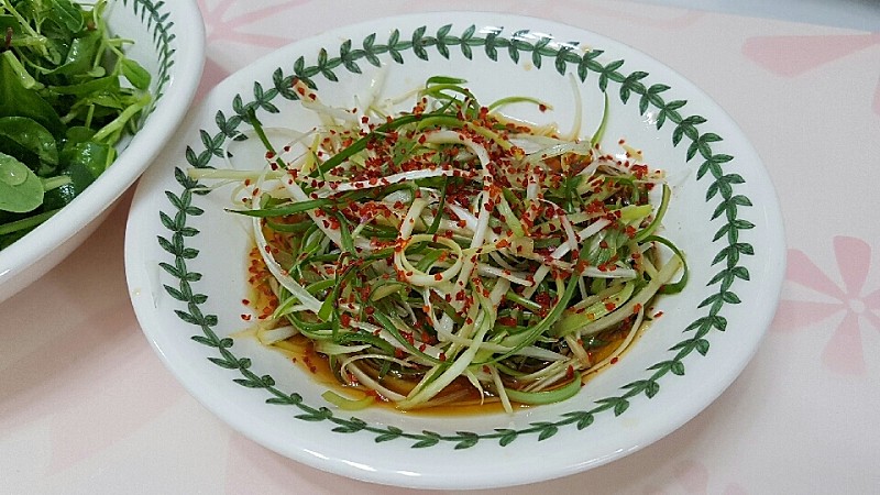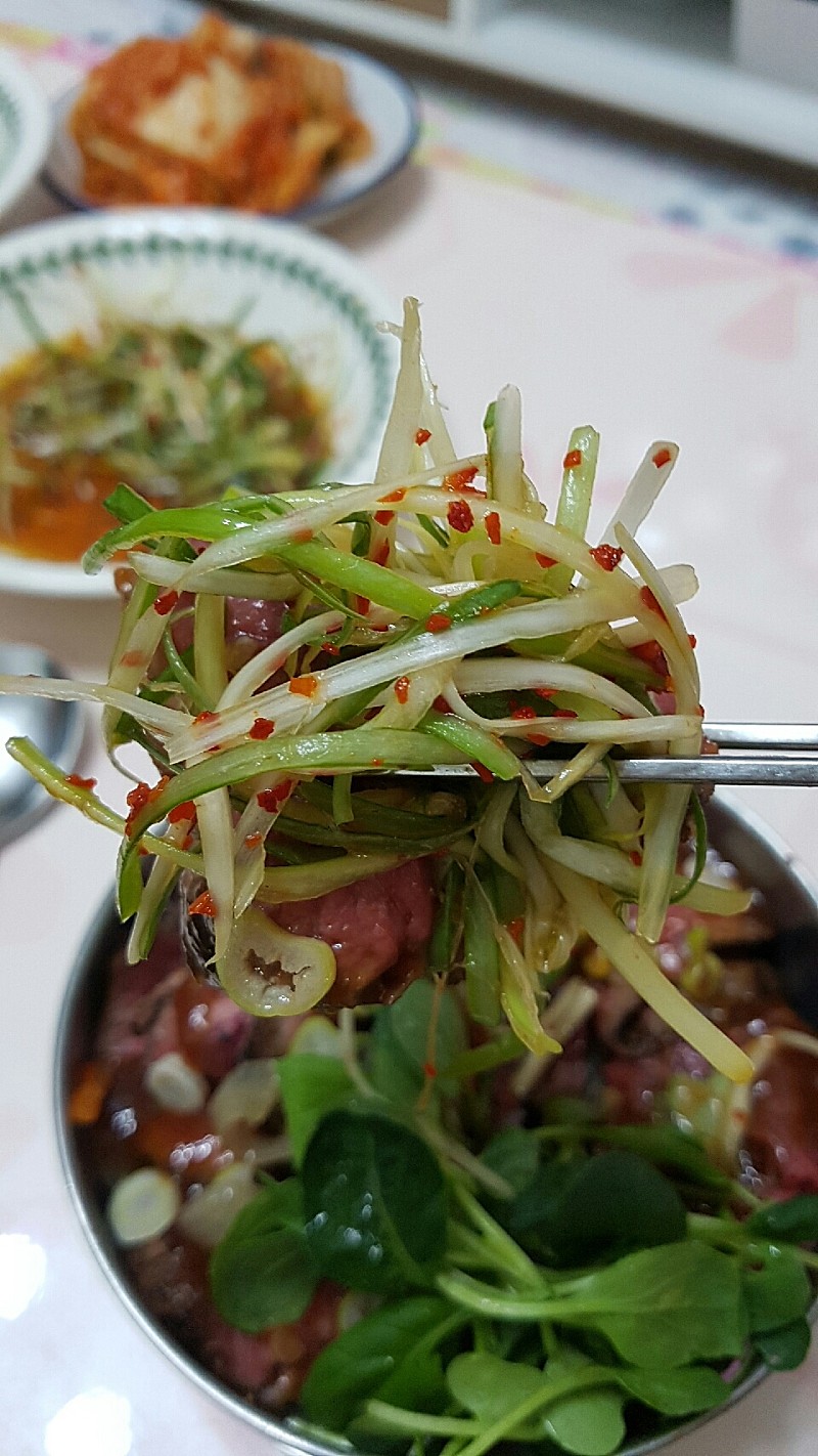 (그 시간동안 샐러드 채소도 씻고 그릇에 담아두고, 정육점에서 준 파채를 씻은 후 간장 두 큰술, 식초 세 큰술, 올리고당 두 큰술 그리고 고춧가루 약간 뿌리고 무쳐뒀습니다.)