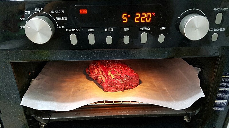 220도로 예열된 오븐에 안심 덩어리를 넣고 5분간만 구워줍니다.